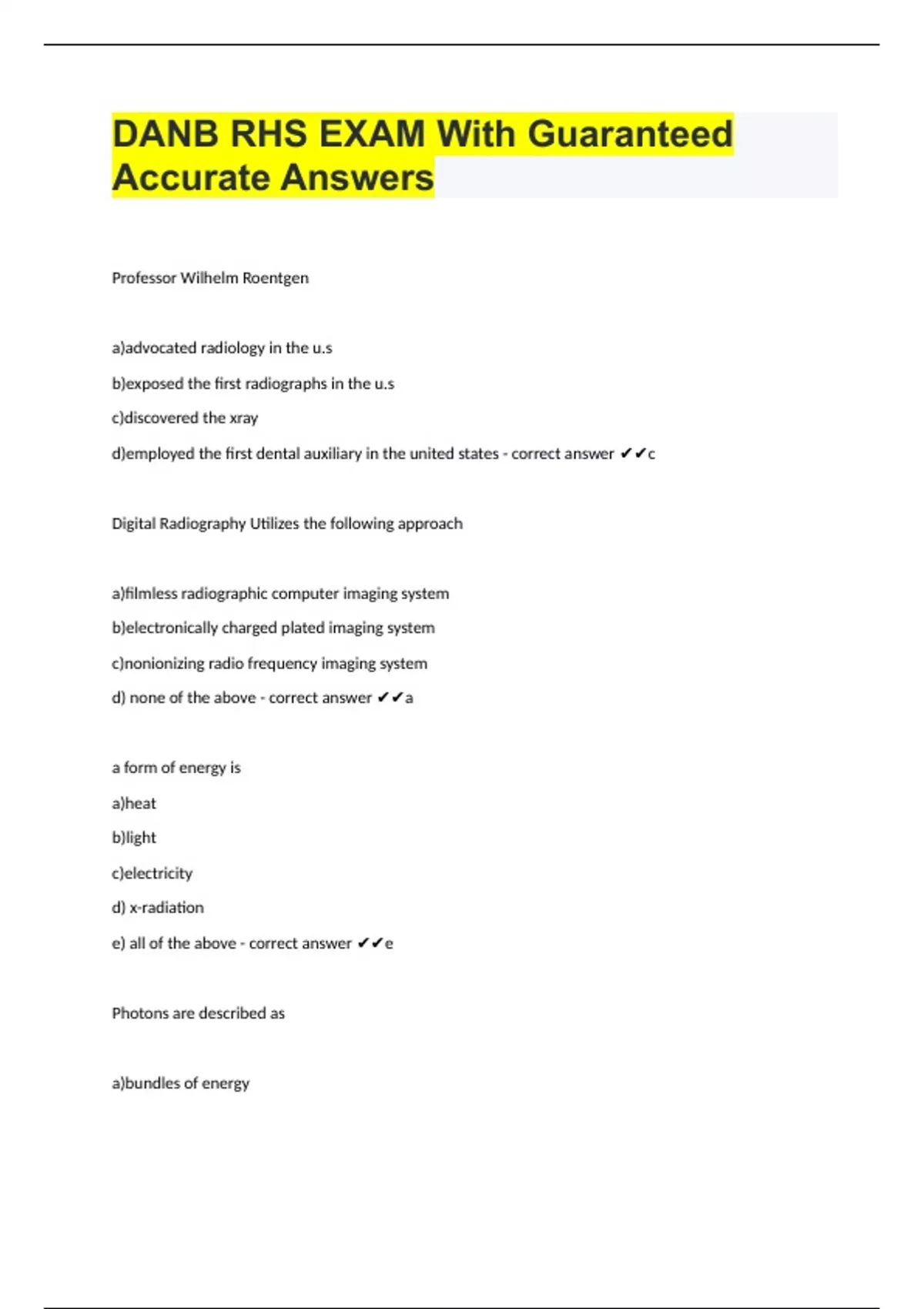Professor Wilhelm Roentgen a)advocated radiology in the u.s b)exposed the first radiographs in the u.s c)discovered the xray d)employed the first dental auxiliary in the united states - correct answer c Digital Radiography Utilizes the following approach a)filmless radiographic computer imaging system b)electronically charged plated imaging system c)nonionizing radio frequency imaging system d) none of the above - correct answer a a form of energy is a)heat b)light c)electricity d) x-radiation e) all of the above - correct answer e Photons are described as a)bundles of energy b) dental film mounts c) electrically neutral particles d) negatively charged atomic particles - correct answer a Limited Penetration long wavelength radiation is known as a) short wavelengths b) hard radiation c) soft radiation d) desirable wavelengths - correct answer c Background Radiation originates from: a)enviornment b) outerspace