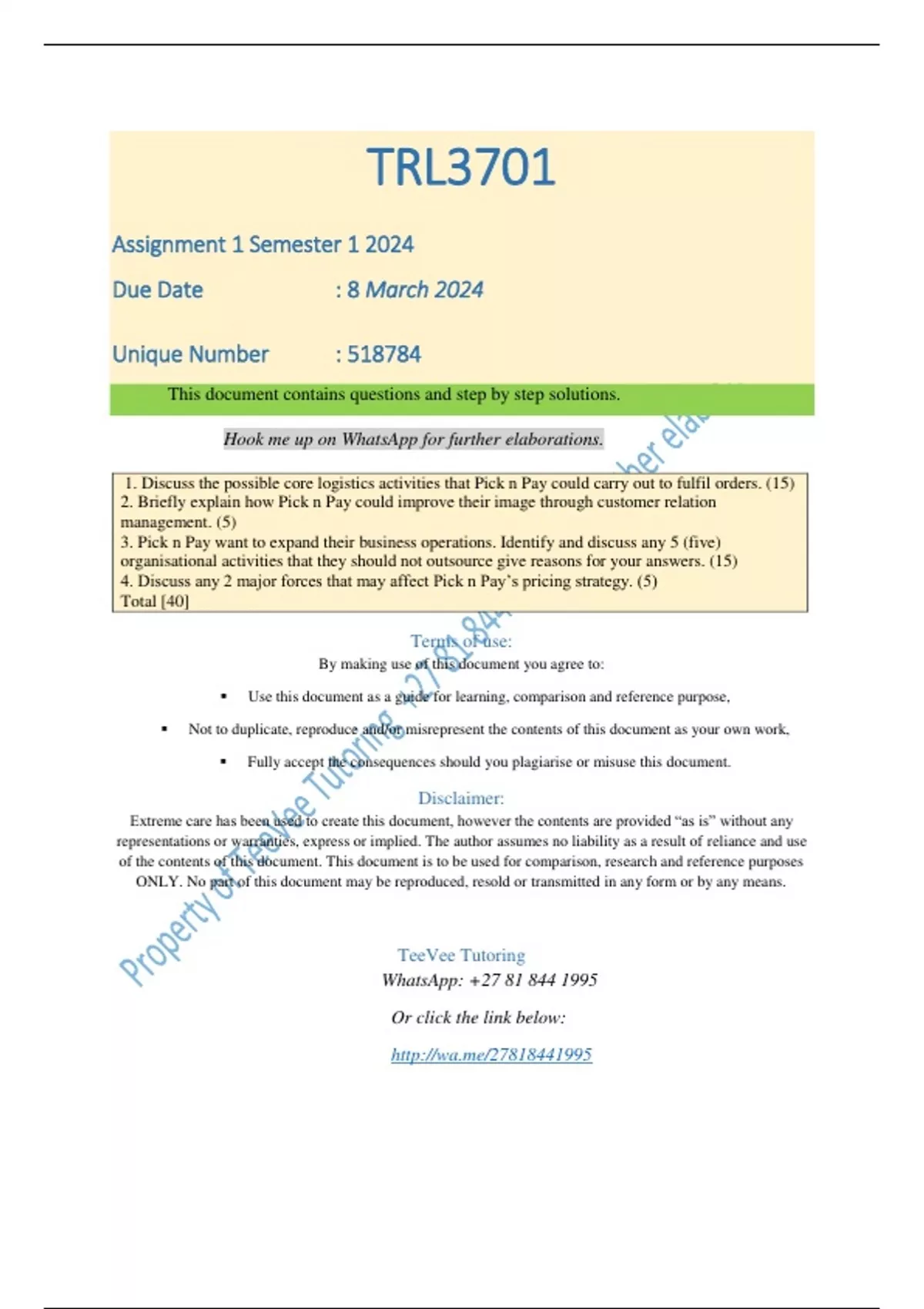 1. Discuss the possible core logistics activities that Pick n Pay could carry out to fulfil orders. (15)
