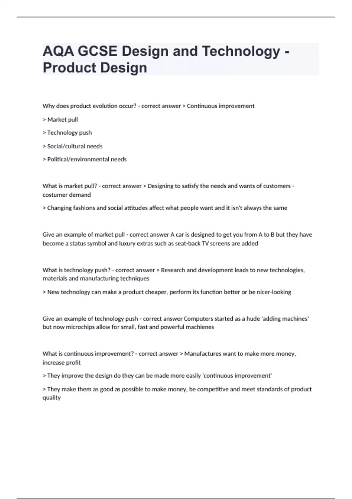 Why does product evolution occur? - correct answer > Continuous improvement > Market pull > Technology push > Social/cultural needs > Political/environmental needs What is market pull? - correct answer > Designing to satisfy the needs and wants of customers - costumer demand > Changing fashions and social attitudes affect what people want and it isn't always the same Give an example of market pull - correct answer A car is designed to get you from A to B but they have become a status symbol and luxury extras such as seat-back TV screens are added What is technology push? - correct answer > Research and development leads to new technologies, materials and manufacturing techniques > New technology can make a product cheaper, perform its function better or be nicer-looking Give an example of technology push - correct answer Computers started as a hude 'adding machines' but now microchips allow for small, fast and powerful machienes What is continuous improvement? - correct answer > Manufactures want to make more money, increase profit > They improve the design do they can be made more easily 'continuous improvement' > They make them as good as possible to make money, be competitive and meet standards of product quality What alternative reasons can a product evolve for? - correct answer > Social or cultural needs (For example, wind-up radios for Africans so they could listen to educational broadcasts about health concerns) > Political or environmental needs (For example, the need for environmentally friendly products such as hybrid engine cars that are more efficient) Name the features of the Arts and Crafts movement - correct answer > Founded by William Morris > Bases on patterns found in nature > Upright and angular > Made by made and skilled craftsmen Name the features of the Art Nouveau movement - correct answer > Designers include Louis C.Tiffany > Flowing and curvy designs > They use floral or insect motifs Name the features of the Art Deco movement - correct answer > Inspired by African and Egyptian art > Bold colours, zigzag and stepped shapes, bold sweeping curves and the sunset motif > Example is the Chrysler building in New York Name the features of the Bauhaus movement - correct answer > Movement from Germany > Has the motto 'form follows function' > Function is most important and appearance is second > It is futuristic, simplistic and used mass production methods > Uses chrome tubing and black leather Name the features of the De Stijl movement - correct answer > Dutch modernist movemnt > Basic - uses simple shapes, horizontal and vertical lines > The three primary colous only > Well known example is Gerrit Rietveld's Red and Blue chair Name the features of the postmodernism movement - correct answer > Rejected 'form follows function' > Put style as the focus point of design > Memphis used bright, contrasting colours and different materials > Some styles contain kitsch and minimalism What are human factors? - correct answer Addressing different needs and values of target groups > Disabled users > Cultural and religious values > Age groups > Ergonomics > Anthropometrics Explain how products can be changed for disabled users - correct answer > Some packaging has Braille for blind users > Buttons can be made bigger and brighter so they are easier to press and find > Products such as smoke alarms can have visible signals as well as audio ones so deaf people are alerted to fires > Instructions can be given in picture or diagram form so people with difficulty reading text can use the product > Wheelchair access must be designed into busses, trains and working stations (like atms) Explain how products can be changed to suit cultural and religious values - correct answer > You can cater for their dietary needs > Create products to suit a particular custom or celebration - like Diwali uses lights > Cultures can use things differently, the Japanese custom is to eat at a low table on the floor > Clothing styles can vary, it could be inappropriate to wear revealing clothing > Colours can have different meaning - Chinese brides wear red for example