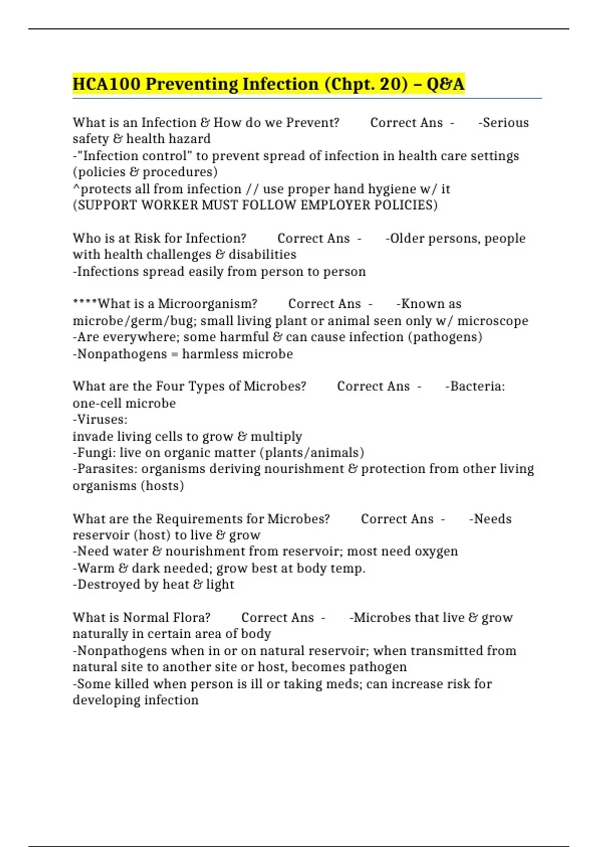 HCA100 Preventing Infection (Chpt. 20) – Q&A