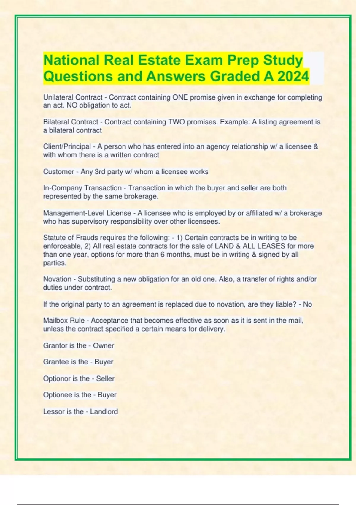 National Real Estate Exam Prep Study Questions and Answers Graded A 2024