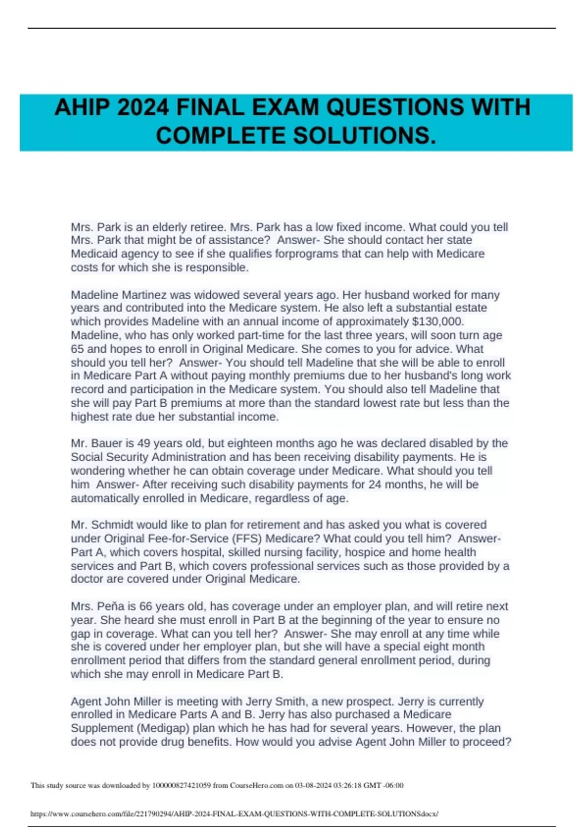 {Answered} AHIP 2024 final exam Questions |Mrs. Park is an elderly retiree.