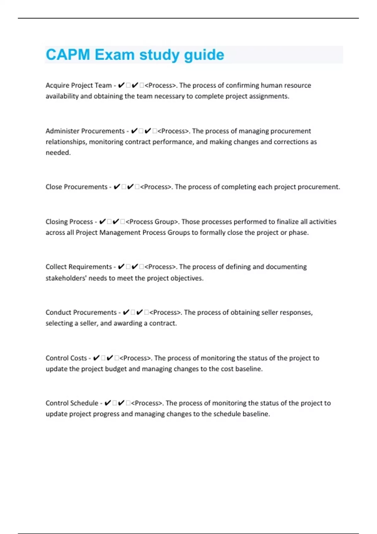 Acquire Project Team - ️️<Process>. The process of confirming human resource availability and obtaining the team necessary to complete project assignments. Administer Procurements - ️️<Process>. The process of managing procurement relationships, monitoring contract performance, and making changes and corrections as needed. Close Procurements - ️️<Process>. The process of completing each project procurement. Closing Process - ️️<Process Group>. Those processes performed to finalize all activities across all Project Management Process Groups to formally close the project or phase. Collect Requirements - ️️<Process>. The process of defining and documenting stakeholders' needs to meet the project objectives. Conduct Procurements - ️️<Process>. The process of obtaining seller responses, selecting a seller, and awarding a contract. Control Costs - ️️<Process>. The process of monitoring the status of the project to update the project budget and managing changes to the cost baseline. Control Schedule - ️️<Process>. The process of monitoring the status of the project to update project progress and managing changes to the schedule baseline.