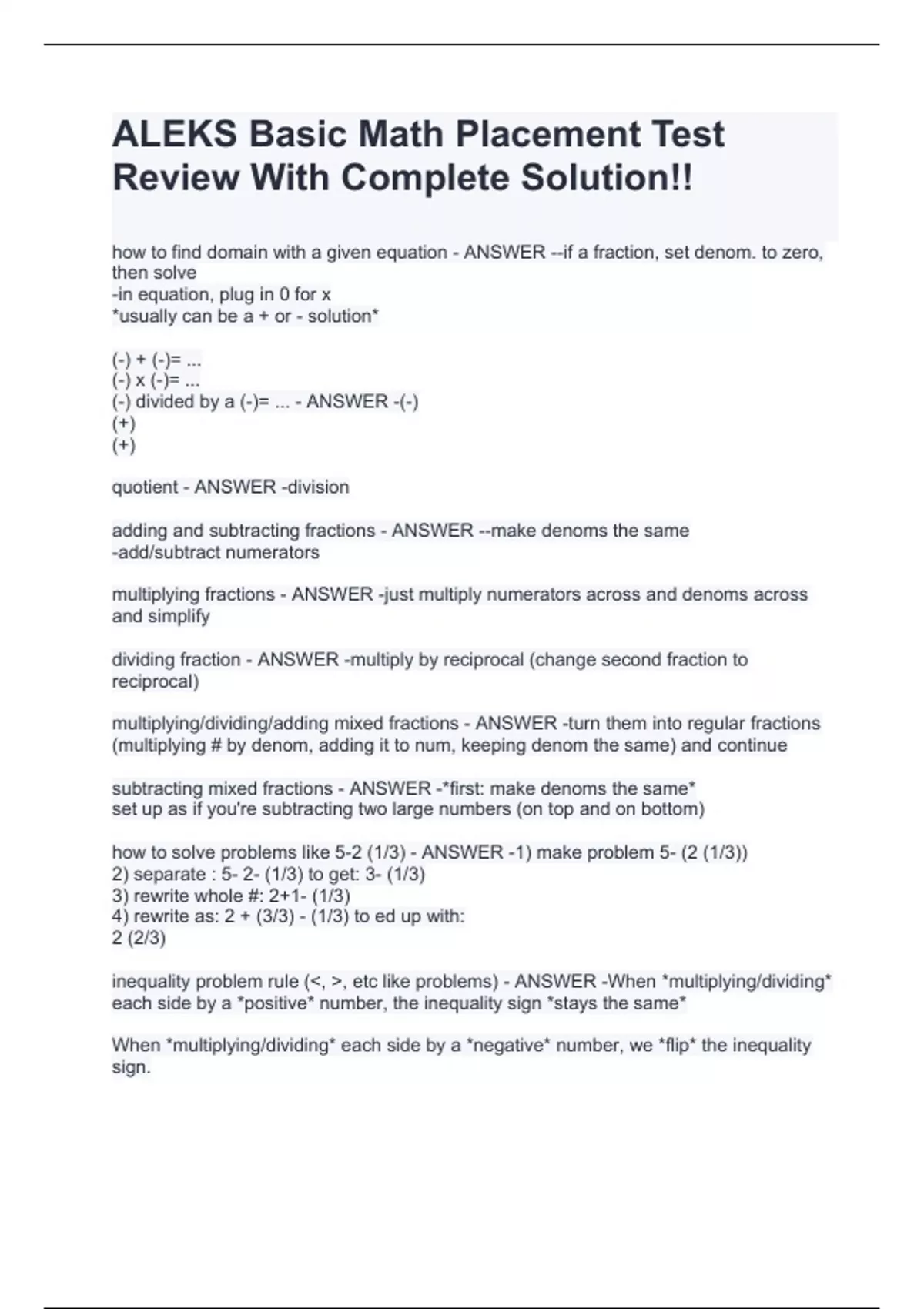 ALEKS Basic Math Placement Test Review With Complete Solution!!