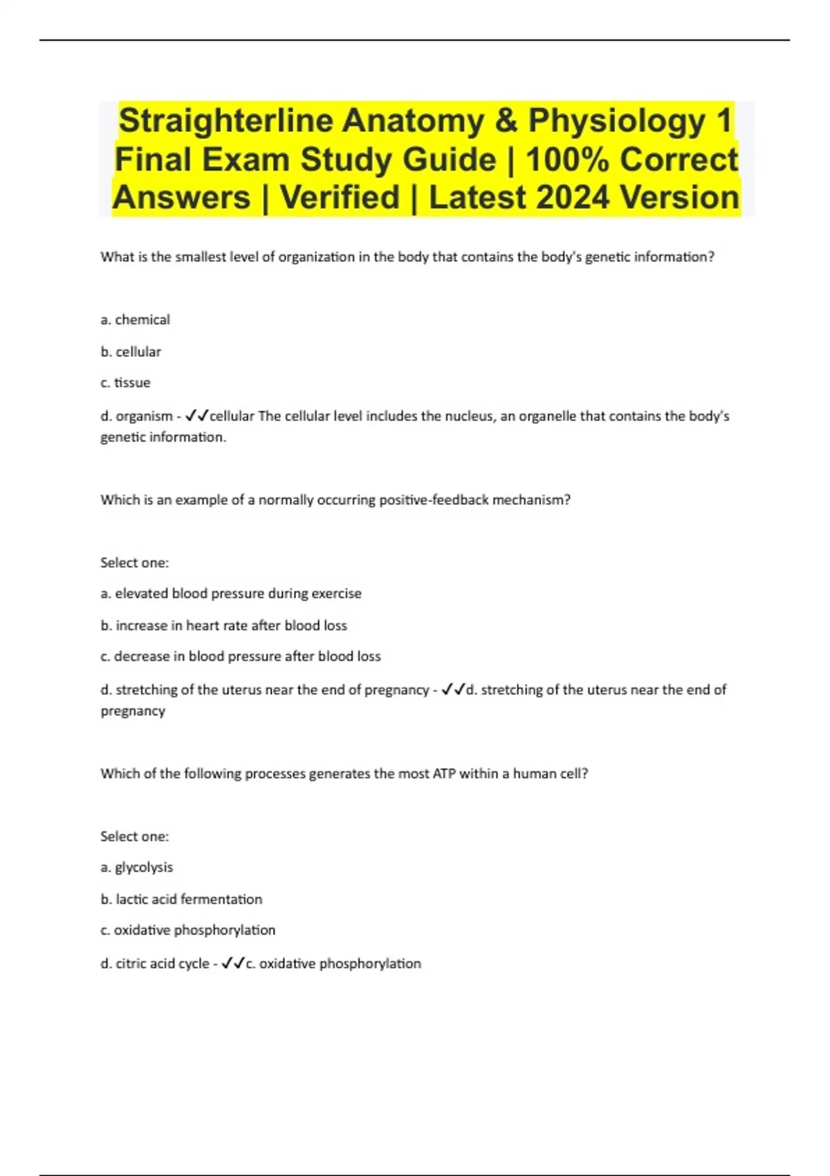 What is the smallest level of organization in the body that contains the body's genetic information? a. chemical b. cellular c. tissue d. organism - cellular The cellular level includes the nucleus, an organelle that contains the body's genetic information. Which is an example of a normally occurring positive-feedback mechanism? Select one: a. elevated blood pressure during exercise b. increase in heart rate after blood loss c. decrease in blood pressure after blood loss d. stretching of the uterus near the end of pregnancy - d. stretching of the uterus near the end of pregnancy Which of the following processes generates the most ATP within a human cell? Select one: a. glycolysis b. lactic acid fermentation c. oxidative phosphorylation d. citric acid cycle - c. oxidative phosphorylation