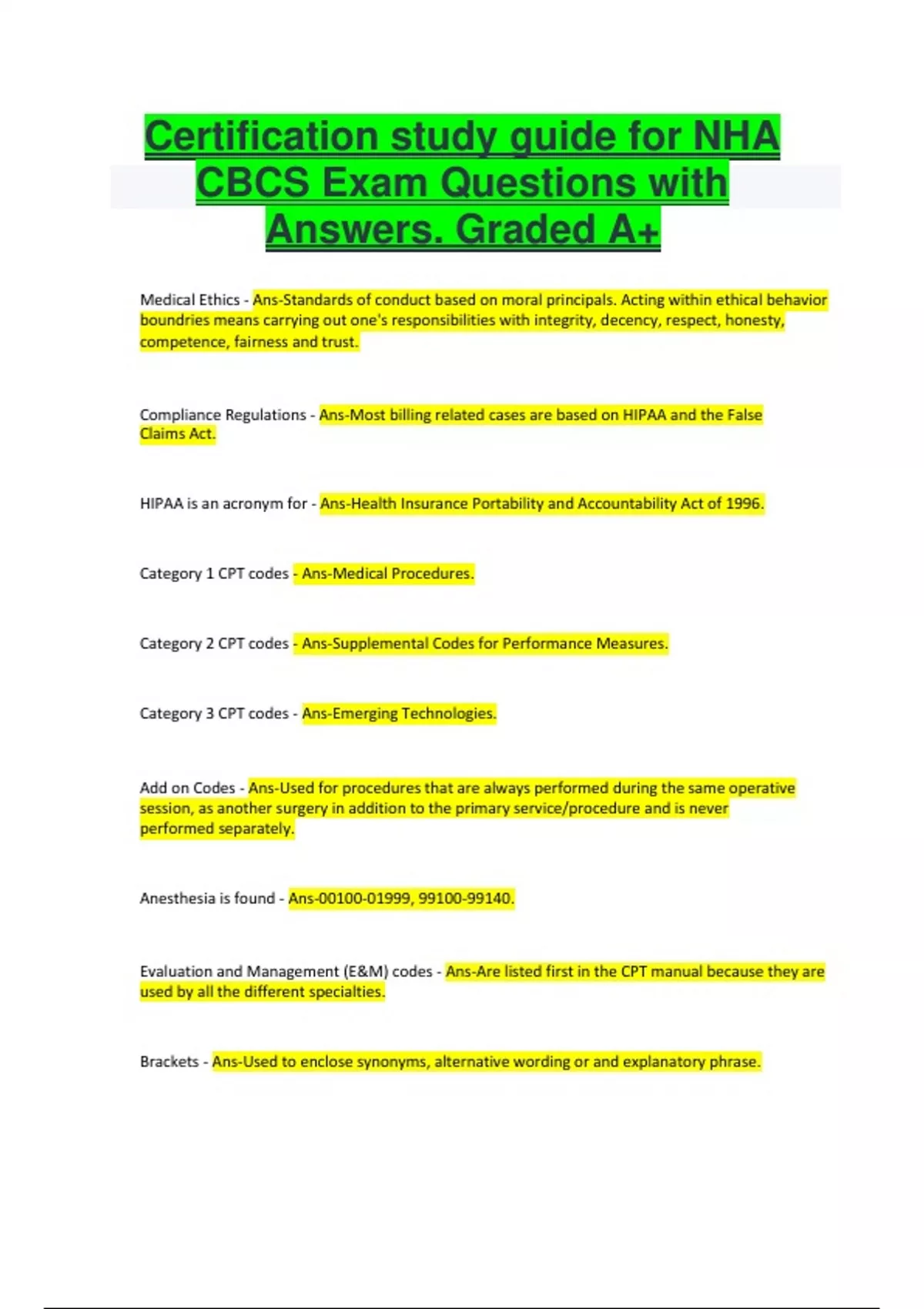 Certification study guide for NHA CBCS Exam Questions with Answers. Graded A+ Medical Ethics - Ans-Standards of conduct based on moral principals. Acting within ethical behavior boundries means carrying out one's responsibilities with integrity, decency, respect, honesty, competence, fairness and trust. Compliance Regulations - Ans-Most billing related cases are based on HIPAA and the False Claims Act. HIPAA is an acronym for - Ans-Health Insurance Portability and Accountability Act of 1996. Category 1 CPT codes - Ans-Medical Procedures. Category 2 CPT codes - Ans-Supplemental Codes for Performance Measures. Category 3 CPT codes - Ans-Emerging Technologies. Add on Codes - Ans-Used for procedures that are always performed during the same operative session, as another surgery in addition to the primary service/procedure and is never performed separately.