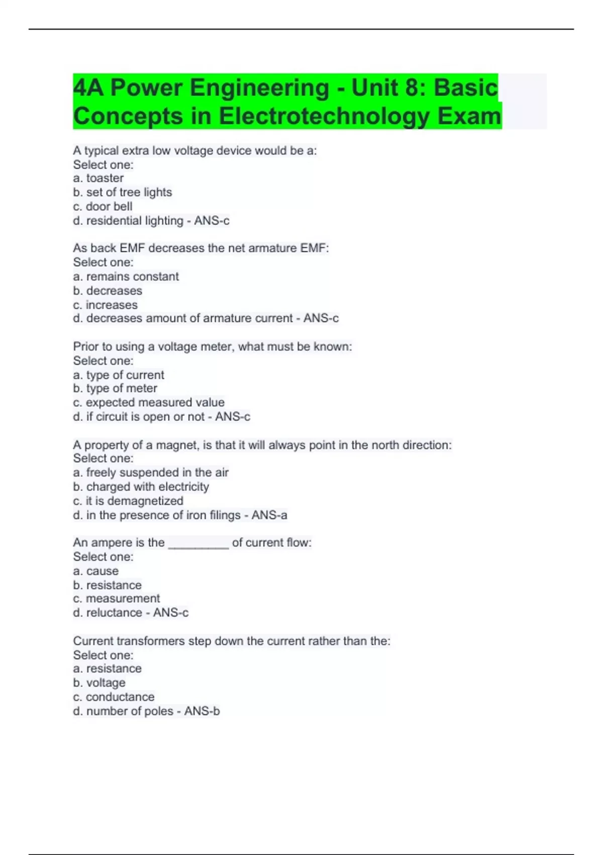 4A Power Engineering - Unit 8: Basic Concepts in Electrotechnology Exam