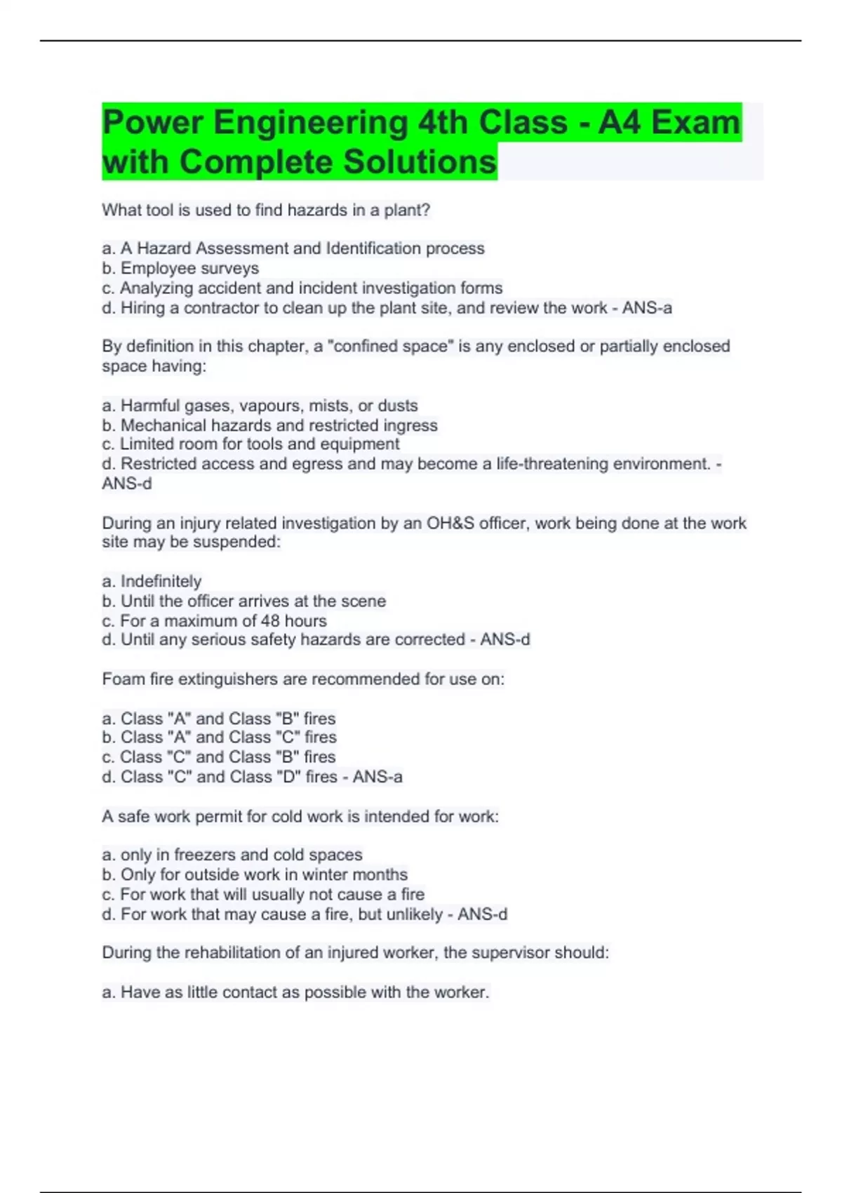 Power Engineering 4th Class - A4 Exam with Complete Solutions