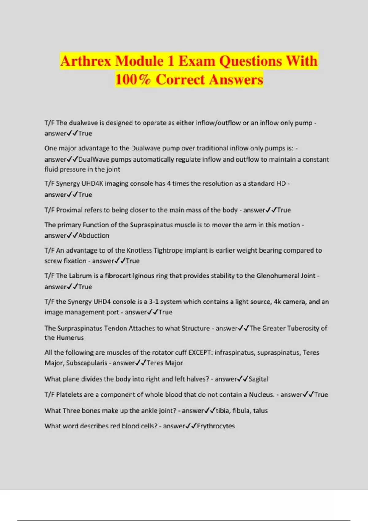 Arthrex Module 1 Exam Questions With 100% Correct Answers T/F The dualwave is designed to operate as either inflow/outflow or an inflow only pump - answerTrue One major advantage to the Dualwave pump over traditional inflow only pumps is: - answerDualWave pumps automatically regulate inflow and outflow to maintain a constant fluid pressure in the joint T/F Synergy UHD4K imaging console has 4 times the resolution as a standard HD - answerTrue T/F Proximal refers to being closer to the main mass of the body - answerTrue The primary Function of the Supraspinatus muscle is to mover the arm in this motion - answerAbduction T/F An advantage to of the Knotless Tightrope implant is earlier weight bearing compared to screw fixation - answerTrue T/F The Labrum is a fibrocartilginous ring that provides stability to the Glenohumeral Joint - answerTrue T/F the Synergy UHD4 console is a 3-1 system which contains a light source, 4k camera, and an image management port - answerTrue