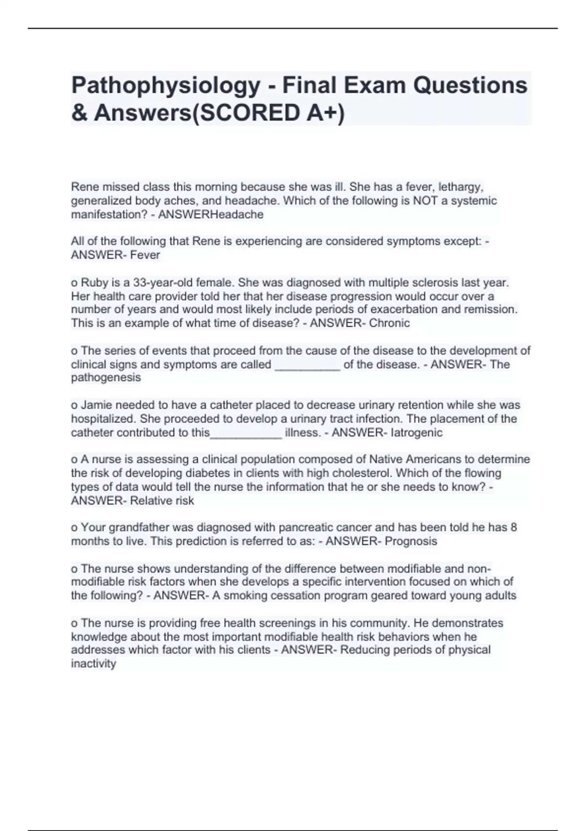 Rene missed class this morning because she was ill. She has a fever, lethargy, generalized body aches, and headache. Which of the following is NOT a systemic manifestation? - ANSWERHeadache All of the following that Rene is experiencing are considered symptoms except: - ANSWER- Fever o Ruby is a 33-year-old female. She was diagnosed with multiple sclerosis last year. Her health care provider told her that her disease progression would occur over a number of years and would most likely include periods of exacerbation and remission. This is an example of what time of disease? - ANSWER- Chronic o The series of events that proceed from the cause of the disease to the development of clinical signs and symptoms are called __________ of the disease. - ANSWER- The pathogenesis o Jamie needed to have a catheter placed to decrease urinary retention while she was hospitalized. She proceeded to develop a urinary tract infection. The placement of the catheter contributed to this___________ illness. - ANSWER- Iatrogenic o A nurse is assessing a clinical population composed of Native Americans to determine the risk of developing diabetes in clients with high cholesterol. Which of the flowing types of data would tell the nurse the information that he or she needs to know? - ANSWER- Relative risk o Your grandfather was diagnosed with pancreatic cancer and has been told he has 8 months to live. This prediction is referred to as: - ANSWER- Prognosis o The nurse shows understanding of the difference between modifiable and non-modifiable risk factors when she develops a specific intervention focused on which of the following? - ANSWER- A smoking cessation program geared toward young adults o The nurse is providing free health screenings in his community. He demonstrates knowledge about the most important modifiable health risk behaviors when he addresses which factor with his clients - ANSWER- Reducing periods of physical inactivity o The nurse is discussing evidence based treatment options for a client with diabetes. Which of the following questions reflects that the nurse understands how to apply evidence based questions. - ANSWER- Of the treatment goals we've discussed, which one do you value the most? o What type of cell to cell communication is involved when a neurotransmitter such as ACh binds to a receptor on a muscle fiber to open up a sodium channel at the neuromuscular junction. - ANSWER- Ligand-gated channels o When crossing the phospholipid bilayer (plasma membrane) of a cell, some substances are too large (like glucose) and cannot pass this semi-permeable membrane. What type of transport is needed to move glucose across the plasma membrane? - ANSWER- Facilitated diffusion o Due to a persistent stressor, columnar cells may turn into squamous cells a method of adaptation. This process is known as: - ANSWER- Metaplasia o When cells change size, shape and structure due to a chronic and persistent stressor, mutations can occur during cell reproduction changing genetic material. Although these cells are not