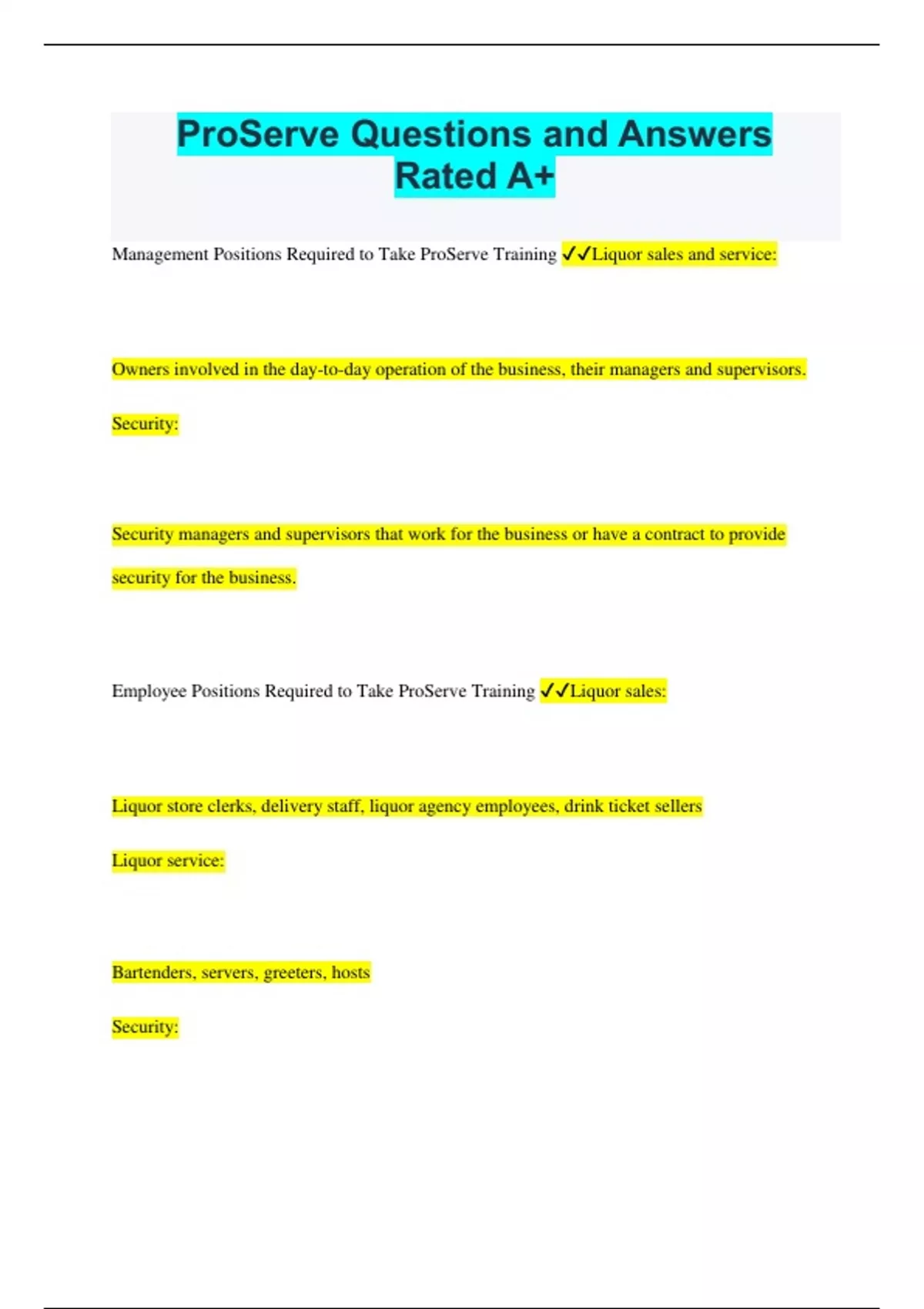 ProServe Questions and Answers Rated A+ Management Positions Required to Take ProServe Training Liquor sales and service: Owners involved in the day-to-day operation of the business, their managers and supervisors. Security: Security managers and supervisors that work for the business or have a contract to provide security for the business. Employee Positions Required to Take ProServe Training Liquor sales: Liquor store clerks, delivery staff, liquor agency employees, drink ticket sellers Liquor service: Bartenders, servers, greeters, hosts Security: Security staff Private clubs, special events and community fundraisers have the same legal responsibilities as businesses that sell or serve liquor for profit. For this reason, many insurance companies require that people selling or serving liquor have valid ProServe training at any time liquor is sold or served on their property. GLC strongly recommends that all holders of Class C and special event licences take ProServe Liquor Staff Training so that the workers understand how to sell and serve liquor responsibly. Volunteers who sell or serve liquor or work as security at a Commercial Public Resale Special Event must have valid ProServe training as of the first date of the special event. Who needs this certification Full- and part-time workers in Class A, B, D, E, F and Duty Free licensed premises or at a Commercial Public Resale Special Event: Licensed premises owners that are responsible for directly managing a licensed premises Managers, supervisors and retailers Bartenders, servers, greeters and hosts Drink ticket sellers Security staff (directly employed or contracted by the licensee) Owners and managers of a company contracted to provide security Full- and part-time liquor agents: Persons registered with the AGLC as a liquor agency and their employees whose duties include the sampling of liquor products oServe helps you understand how to sell and serve liquor responsibly in situations where liquor is sold and/or served. This includes selling closed liquor to a person at a liquor store or selling and serving open liquor or mixed drinks to a person who will drink it where it was bought (in a bar, restaurant, stadium, casino). It also includes other jobs connected with liquor service (for example, a delivery service, security, liquor sampling, selling liquor tickets). ProServe helps sellers and servers of liquor to understand what duty of care is, and how to prevent foreseeable harm to customers and patrons. The program also helps staff and volunteers understand some of Alberta's liquor laws and what AGLC's policies are. These rules are in place to help protect people who work in the liquor industry, their customers, patrons and property from liquor-related harms. This program does not include information on all liquor laws or policies. Here are tips about learning the information in the ProServe program: The portions of policy that are related to social responsibility are discussed in this course. The full policy, laws and regulations that apply to licensees and their employees are available at AGLC's website at . Whether you work in a liquor store or in a place where liquor is sold and served, the general concepts in this program will be useful for you to do your job responsibly. If an idea doesn't seem useful right away, don't