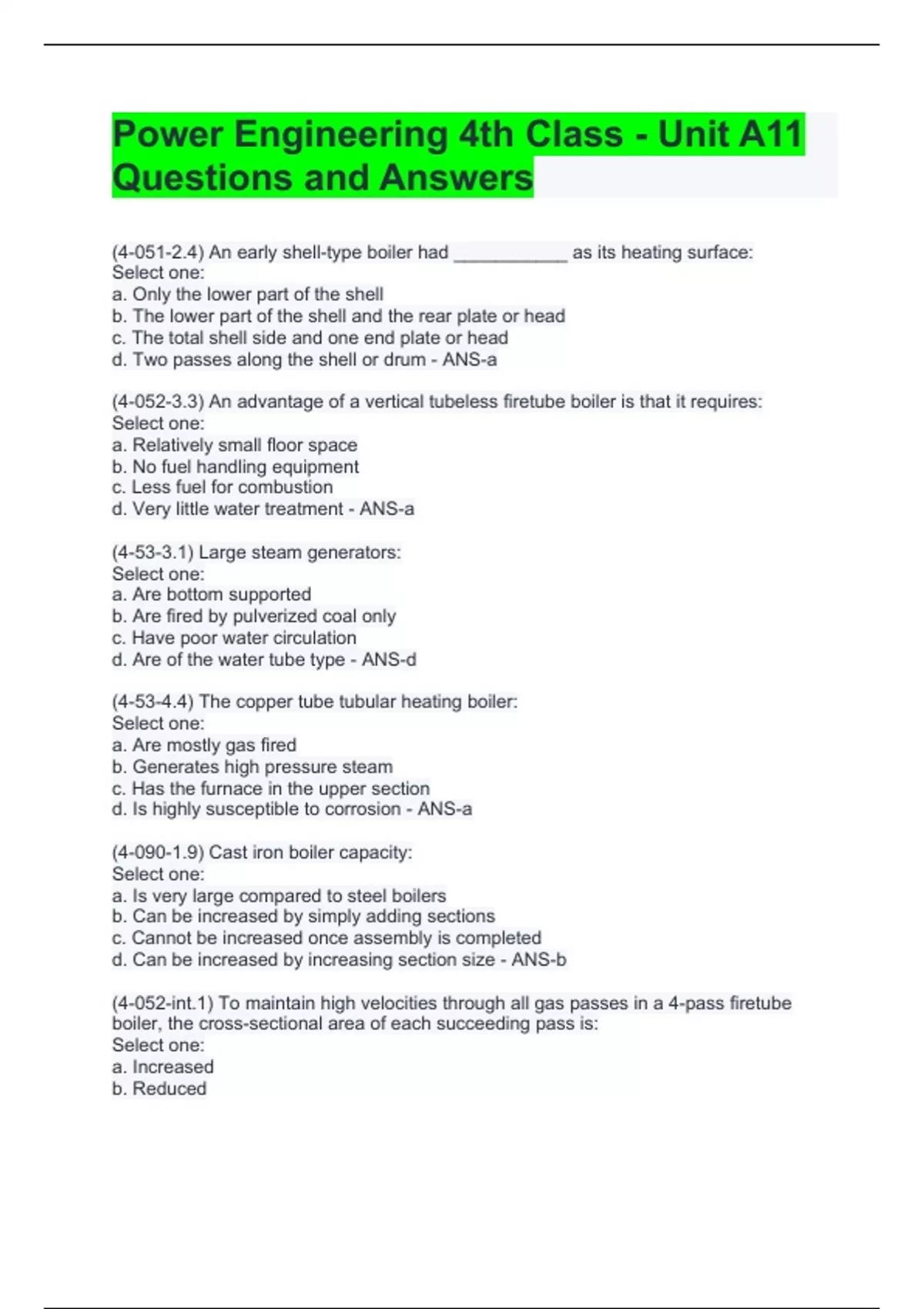 Power Engineering 4th Class - Unit A11 Questions and Answers
