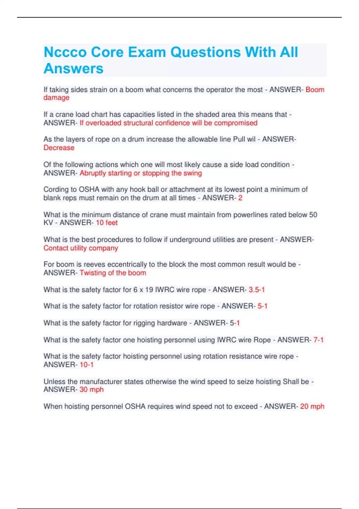 Nccco Core Exam Questions With All Answers If taking sides strain on a boom what concerns the operator the most - ANSWER- Boom damage If a crane load chart has capacities listed in the shaded area this means that - ANSWER- If overloaded structural confidence will be compromised As the layers of rope on a drum increase the allowable line Pull wil - ANSWER- Decrease Of the following actions which one will most likely cause a side load condition - ANSWER- Abruptly starting or stopping the swing Cording to OSHA with any hook ball or attachment at its lowest point a minimum of blank reps must remain on the drum at all times - ANSWER- 2 What is the minimum distance of crane must maintain from powerlines rated below 50 KV - ANSWER- 10 feet What is the best procedures to follow if underground utilities are present - ANSWER- Contact utility company For boom is reeves eccentrically to the block the most common result would be - ANSWER- Twisting of the boom What is the safety factor for 6 x 19 IWRC wire rope - ANSWER- 3.5-1 What is the safety factor for rotation resistor wire rope - ANSWER- 5-1 What is the safety factor for rigging hardware - ANSWER- 5-1 What is the safety factor one hoisting personnel using IWRC wire Rope - ANSWER- 7-1 What is the safety factor hoisting personnel using rotation resistance wire rope - ANSWER- 10-1 Unless the manufacturer states otherwise the wind speed to seize hoisting Shall be - ANSWER- 30 mph When hoisting personnel OSHA requires wind speed not to exceed - ANSWER- 20 mph Who has the responsibility of determining the correct weight of the load - ANSWER- Supervisor When an operator leave there a crane they must - ANSWER- Land load engage all locks and Pawls and lock machine When is it safe to work closer than alarm for distance from any powerline - ANSWER- When the utility company certifies that the lines are D energized When operating a crawler crane what is the most unstable allowable quadrant of operation - ANSWER- Side What is not a good location for crane set up - ANSWER- Above utilities If an operator arrives at a job site and the crane is already set up how would he checked the main an auxiliary breaks - ANSWER- Left the load a few inches off the ground and test the brakes Tipping capacities for crawler cranes are based on - ANSWER- 75% The term load radius is best defined as - ANSWER- The distance from the center of rotation of the crane to the center of gravity of the suspended load Should the load be applied when determining the proper boom angle - ANSWER- Yes When telescoping the boom section of a rubber tire which section should be telescoped first - ANSWER- All sections should be telescoped equally Hooks must be discarded if a twist more than is found - ANSWER- 0 degrees Hooks must be discarded if a throat opening of more than is found - ANSWER- 5° Wire rope must be removed from service if any of the following conditions exist - ANSWER- Six randomly distributed broken wires Wear of more than 1/3 of the outside diameter three broken wires and one strand of one lay length When arriving first on the job site the operator should first determine the condition of the - ANSWER- Access roads Basket hitch is rated of a vertical hitch - ANSWER- 200% How many broken wires must be present in one strand of one lay for running wire rope to be removed from service - ANSWER- 3 How many broken wires must be present in rotation resistant wire rope to be removed from service - ANSWER- 2 in six diameters What is the minimum clearance needed between cranes counterweight and any obstacle - ANSWER- 2 feet To restrict access to a crane swing radius the operator must - ANSWER- Barricade the area around the crane You should always have at least how many wraps on A hoist drum - ANSWER- 2 When working around powerlines you must - ANSWER- Never stockpile material under powerlines Maintain the correct distance according to the rated KV Ground the crane with the proper grounding cable Boom angle is best described as - ANSWER- The angle between the loaded boom and the horizontal What is the best procedure to follow when underground utilities may be present - ANSWER- Contact local utility company When using cable or nylon spreaders it is important to remember - ANSWER- The lower the spreader angle the greater the tension When is spinning load presents a danger the operator should - ANSWER- Use a tagline Parts of line means - ANSWER- The number of lines running through the load block A sudden start or stop while operating a crane produces - ANSWER- A dynamic load What percent of a cranes rated capacity is it classified as a critical lift - ANSWER- 75% During disassembly of a long boom the hog lines are connected on a maximum cantilever point and the boom is slightly lifted off the ground which pins are to be removed next - ANSWER- The bottom pins ahead of the cantilever point If you were to make a left using a four legged bridle how many legs are you going to calculate the load - ANSWER- 3 According to OSHA all cranes equipped with a luffing jib must have - ANSWER- Check valve