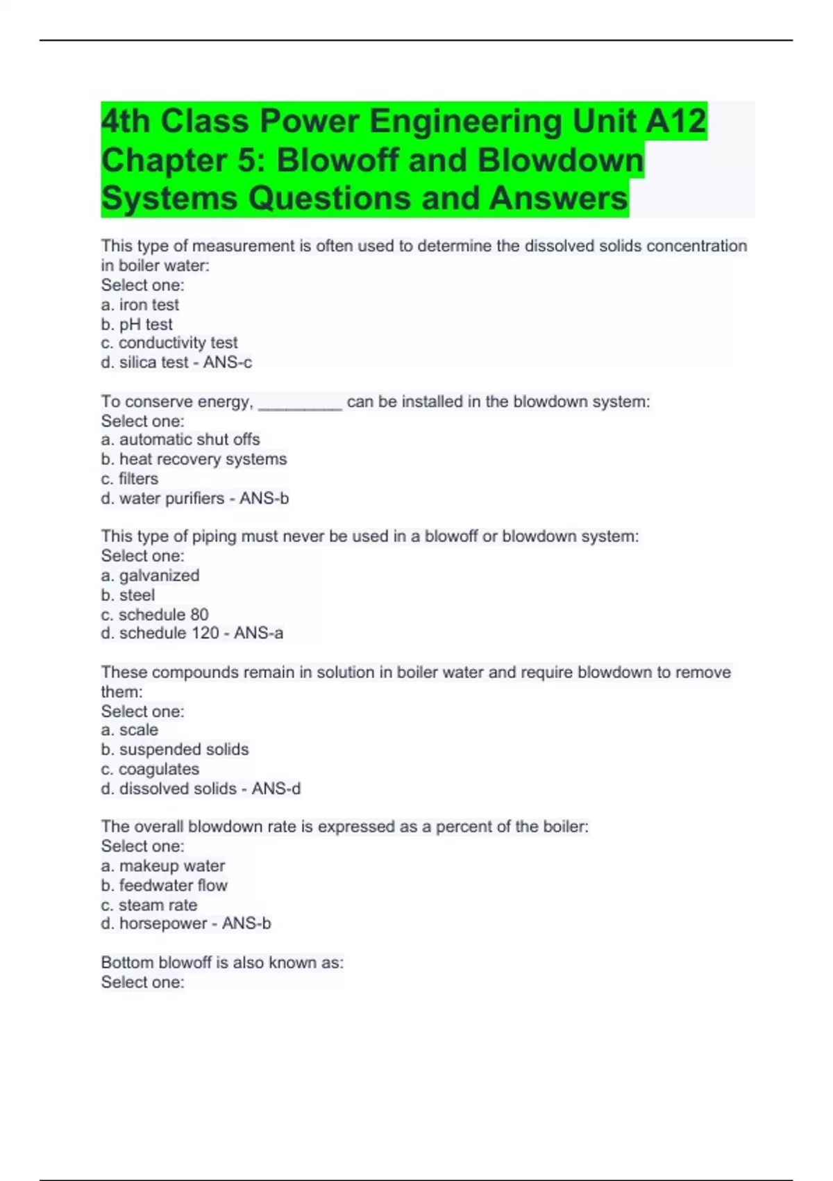 4th Class Power Engineering Unit A12 Chapter 5: Blowoff and Blowdown Systems Questions and Answers