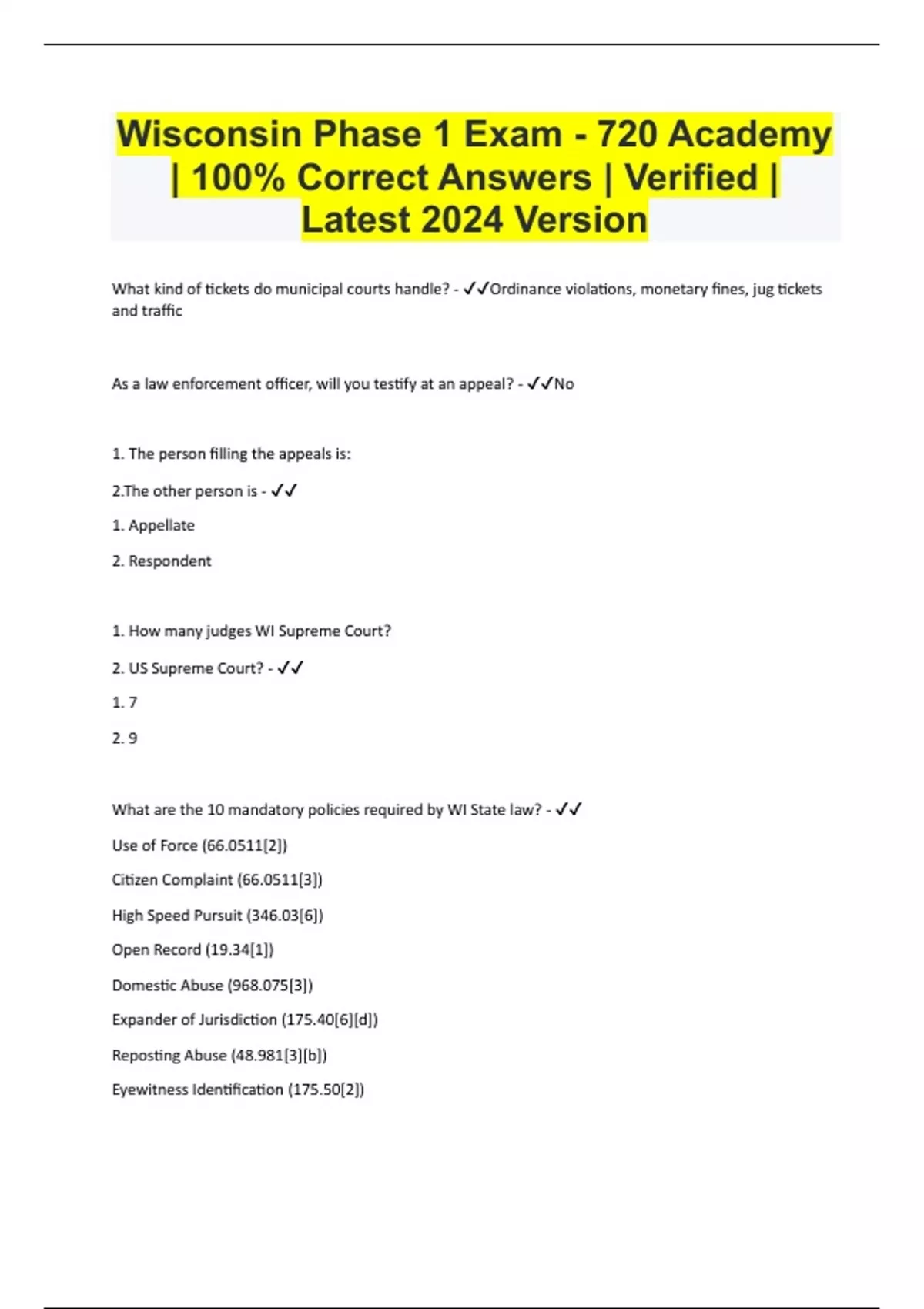 Wisconsin Phase 1 Exam - 720 Academy | 100% Correct Answers | Verified | Latest 2024 Version