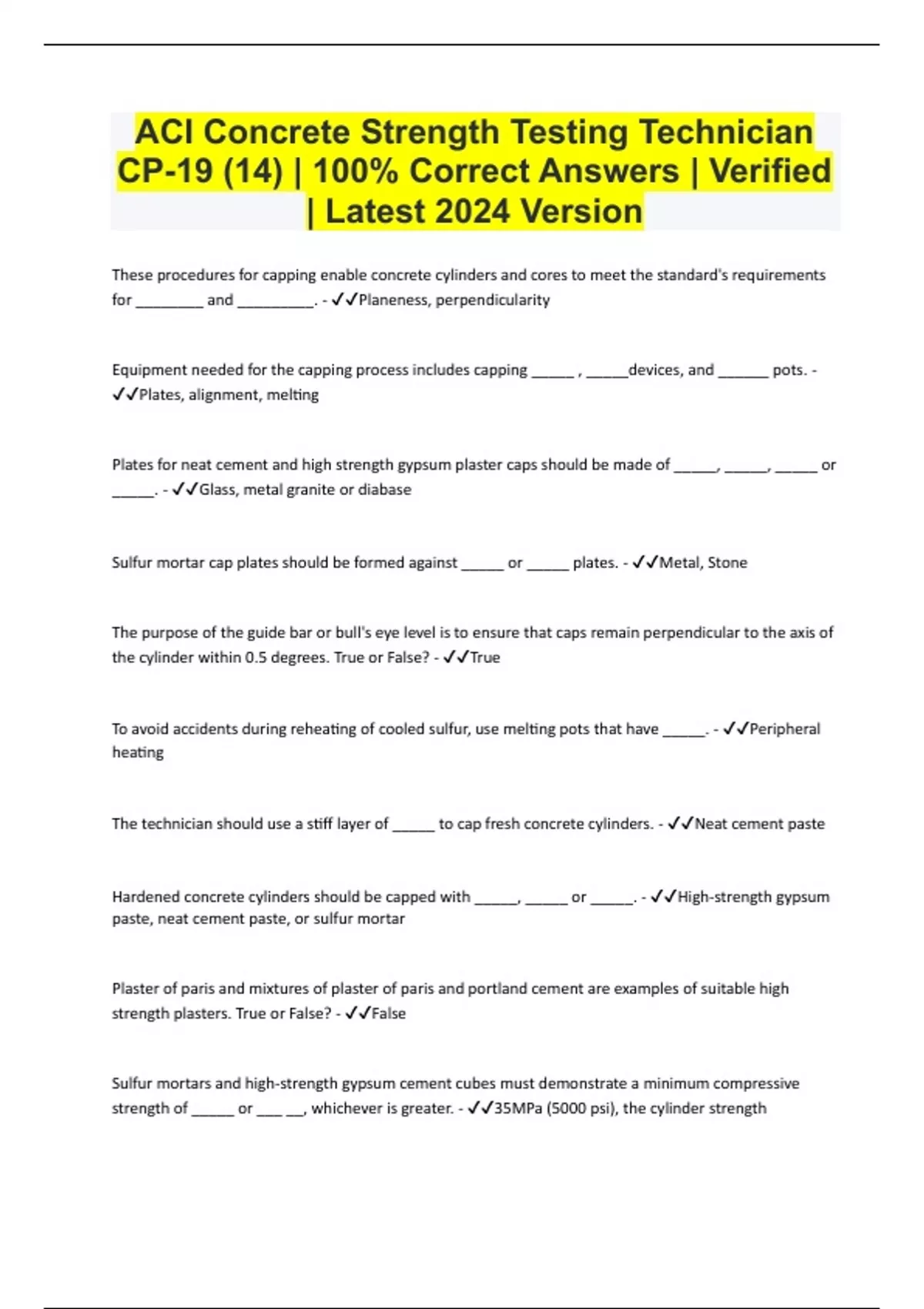 ACI Concrete Strength Testing Technician CP-19 (14) | 100% Correct Answers | Verified | Latest 2024 Version