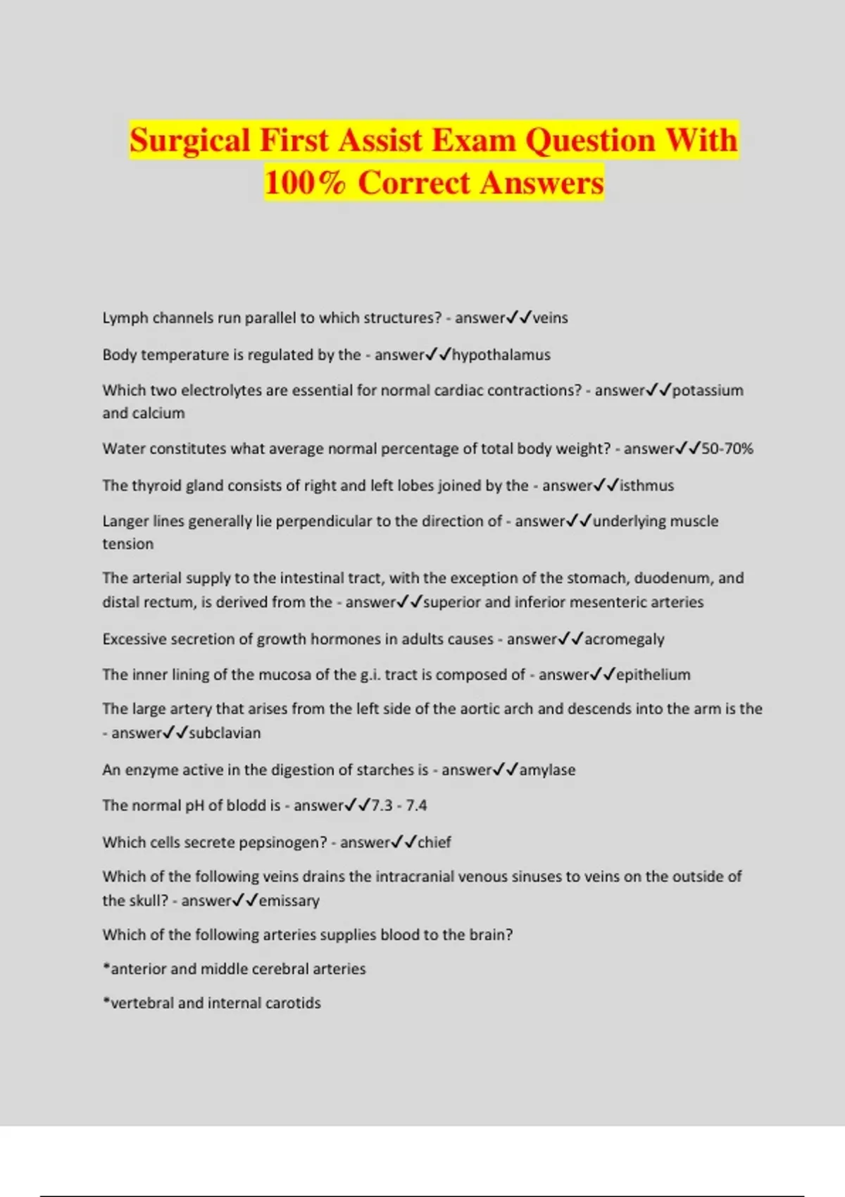 Surgical First Assist Exam Question With 100% Correct Answers Lymph channels run parallel to which structures? - answerveins Body temperature is regulated by the - answerhypothalamus Which two electrolytes are essential for normal cardiac contractions? - answerpotassium and calcium Water constitutes what average normal percentage of total body weight? - answer50-70% The thyroid gland consists of right and left lobes joined by the - answeristhmus Langer lines generally lie perpendicular to the direction of - answerunderlying muscle tension The arterial supply to the intestinal tract, with the exception of the stomach, duodenum, and distal rectum, is derived from the - answersuperior and inferior mesenteric arteries Excessive secretion of growth hormones in adults causes - answeracromegaly The inner lining of the mucosa of the g.i. tract is composed of - answerepithelium The large artery that arises from the left side of the aortic arch and descends into the arm is the - answersubclavian An enzyme active in the digestion of starches is - answeramylase The normal pH of blodd is - answer7.3 - 7.4 Which cells secrete pepsinogen? - answerchief Which of the following veins drains the intracranial venous sinuses to veins on the outside of the skull? - answeremissary Which of the following arteries supplies blood to the brain? *anterior and middle cerebral arteries *vertebral and internal carotids *external and internal carotids *occipital and thyrocervical - answervertebral and internal carotids Which of the follwing arteries divides into the anterior and middle cerebral arteries? *internal carotid *external carotid *vertebral *basilar - answerinternal carotid Which of the following arteries is a direct branch of the internal carotid? - answermiddle cerebral The lateral ventricles within the cerebral hemisphere communicate with the third ventricle through the opening called - answerForamen of Monro The third ventricle of the brain empties into the fourth ventricle through the - answerAqueduct of Sylvius Spinal fluid is produced by the - answerchoroid plexus The fold of dura mater that seperates the cerebral hemispheres - answerfalx cerebri Which of the following seperates the frontal and temporal lobes? *fissure of sylvius *fissure of rolando *fissure of bichat *longitudinal fissure - answerfissure of sylvius The frontal lobe is bounded posteriorly by the central sulcus, also called the - answerfissure of rolando Which of the following areas located in the fronal gyrus of the brain controls of the function of speech? - answerbrocas The white line of Hilton is situated - answerbetween the external and internal anal sphincters A chemical reaction that provides energy by the breakdown of food molecules is called - answercatabolism Adipose tissue lies in which skin layer? - answersubcutaneous Collagen is produced by which connective tissue cells? - answerfibroblasts What is normal cardiac output for an adult? - answer4-8L/minute Which vein drains the right side of the vertebral column? - answerazygos Which arteries supplies the cecum, ascending colon, hepatic flexure, and proximal portion of the transverse colon? - answersuperior mesenteric The celiac artery trifurcates into the - answerleft gastric, splenic, and hepatic arteries A prolongation of the breast tissue located in the upper, outer part of the breast that passes through an opening in the axillary fascia is called the - answeraxillary tail of Spence The mammary gland is fixed to the overlying skin and underlying pectoral fascia by fibrous bands known as - answersuspensory ligaments of cooper The arterial blood supply to the breast is supplied from branches of the - answerinternal mammary, axillary and lateral thoracic What is the loose areolar tissue that seperates the breast fromt he pectoralis major muscle? - answerretromammary space Which lymph nodes are located between the pectoralis major and minor muscles? - answerrotter Which nerves travel along the anterior-lateral chest wall and innervates the serratus anterior muscle? - answerlong thoracic What nerves innervates the latissimus dorsi muscle? - answerthoracodorsal The nerve of Grassi is associated with the - answerstomach The veins of sappey drain the - answerdiaphragm The node of Lund is located in the - answerTriangle of Calot Where is Hartmann's pouch located? - answergallbladder infundibulum The small ducts that drain bile directly into the gallbladder are called - answerHepatic What is the name for the small pancreatic duct? - answerSantorini The three structures that form the anatomical triangle of Calot are - answercystic duct, common hepatic duct, lower edge of the liver The point of seperation between the posterior rectus sheath superiorly and absence of the sheath inferiorly is called the - answerarcuate lin