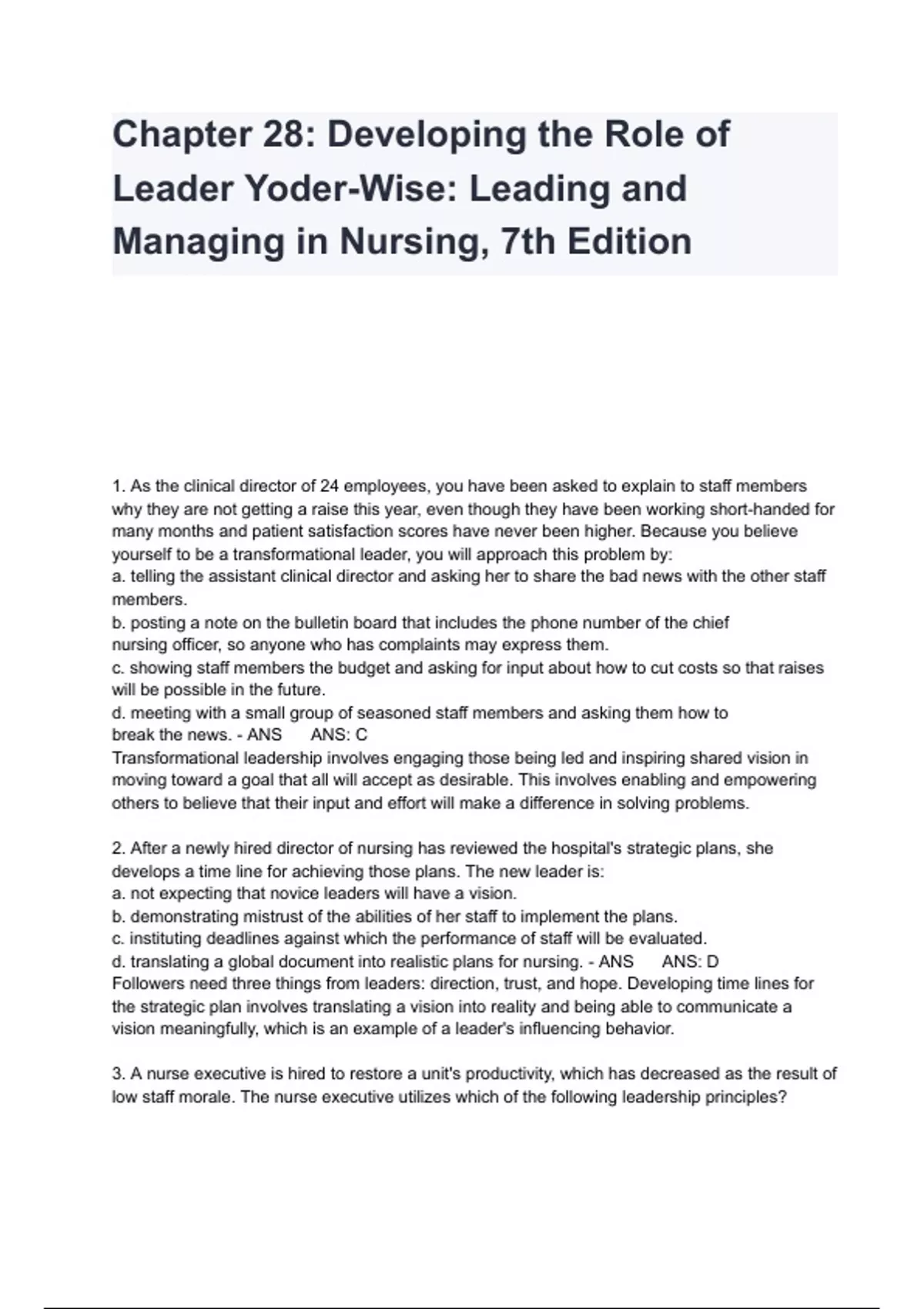Chapter 28: Developing the Role of Leader Yoder-Wise: Leading and Managing in Nursing, 7th Edition 1. As the clinical director of 24 employees, you have been asked to explain to staff members why they are not getting a raise this year, even though they have been working short-handed for many months and patient satisfaction scores have never been higher. Because you believe yourself to be a transformational leader, you will approach this problem by: a. telling the assistant clinical director and asking her to share the bad news with the other staff members. b. posting a note on the bulletin board that includes the phone number of the chief nursing officer, so anyone who has complaints may express them. c. showing staff members the budget and asking for input about how to cut costs so that raises will be possible in the future. d. meeting with a small group of seasoned staff members and asking them how to break the news. - ANS ANS: C Transformational leadership involves engaging those being led and inspiring shared vision in moving toward a goal that all will accept as desirable. This involves enabling and empowering others to believe that their input and effort will make a difference in solving problems. 2. After a newly hired director of nursing has reviewed the hospital's strategic plans, she develops a time line for achieving those plans. The new leader is: a. not expecting that novice leaders will have a vision. b. demonstrating mistrust of the abilities of her staff to implement the plans. c. instituting deadlines against which the performance of staff will be evaluated. d. translating a global document into realistic plans for nursing. - ANS ANS: D Followers need three things from leaders: direction, trust, and hope. Developing time lines for the strategic plan involves translating a vision into reality and being able to communicate a vision meaningfully, which is an example of a leader's influencing behavior. 3. A nurse executive is hired to restore a unit's productivity, which has decreased as the result of low staff morale. The nurse executive utilizes which of the following leadership principles? a. The leader declares the intent and goals to enhance productivity and assumes that the unit also wishes to increase productivity, which allows nurses to feel in control of the environment. b. If staff members increase productivity, then they are given opportunity to engage in learning events such as workshops and conferences. If the staff members are not satisfied, they will insist on a different leader, who will get them what they want. c. Leaders at the national level who are seeking relief for nurses in the workplace are seen as the solution to the nursing shortage.