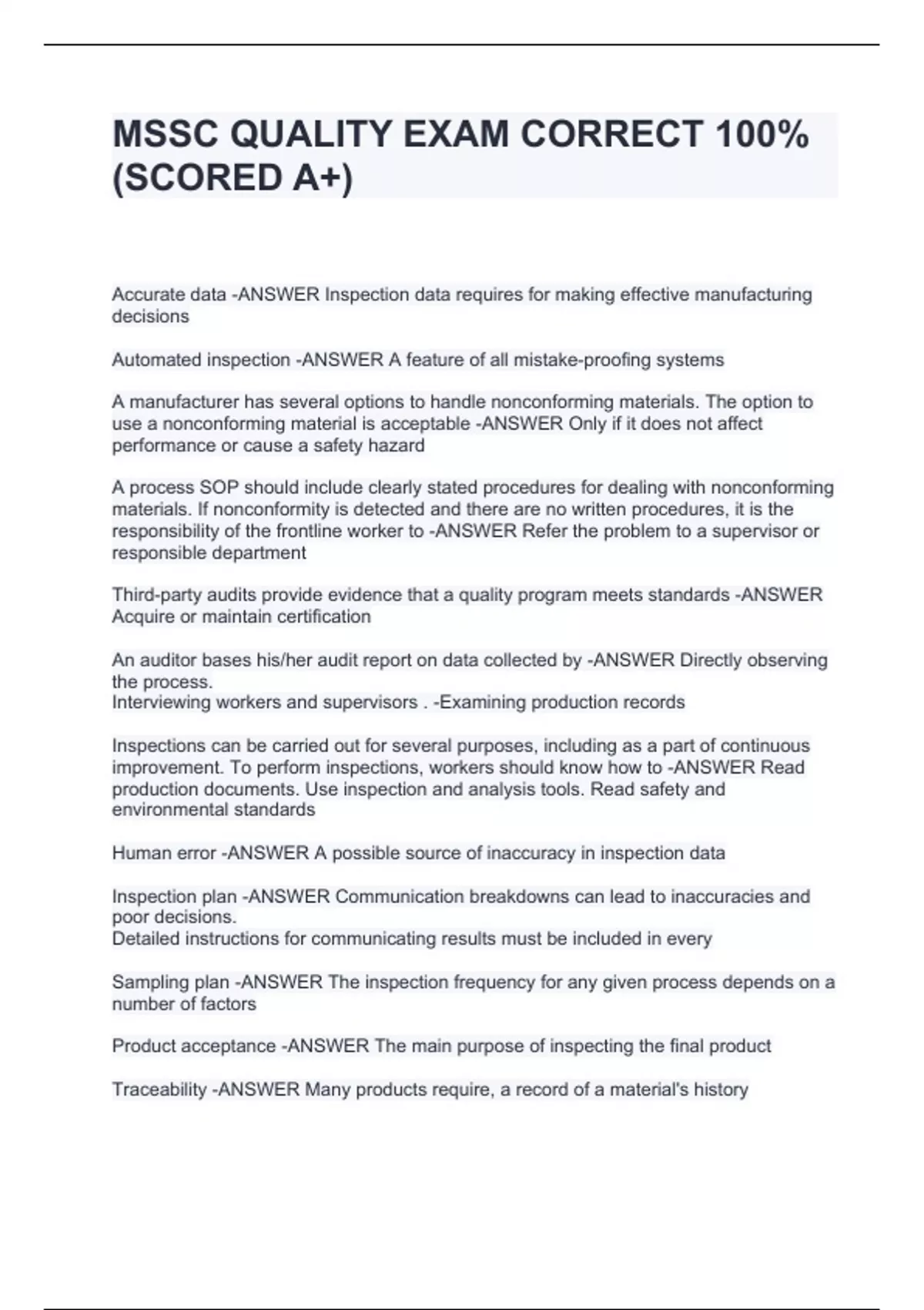 Accurate data -ANSWER Inspection data requires for making effective manufacturing decisions Automated inspection -ANSWER A feature of all mistake-proofing systems A manufacturer has several options to handle nonconforming materials. The option to use a nonconforming material is acceptable -ANSWER Only if it does not affect performance or cause a safety hazard A process SOP should include clearly stated procedures for dealing with nonconforming materials. If nonconformity is detected and there are no written procedures, it is the responsibility of the frontline worker to -ANSWER Refer the problem to a supervisor or responsible department Third-party audits provide evidence that a quality program meets standards -ANSWER Acquire or maintain certification An auditor bases his/her audit report on data collected by -ANSWER Directly observing the process. Interviewing workers and supervisors . -Examining production records Inspections can be carried out for several purposes, including as a part of continuous improvement. To perform inspections, workers should know how to -ANSWER Read production documents. Use inspection and analysis tools. Read safety and environmental standards Human error -ANSWER A possible source of inaccuracy in inspection data Inspection plan -ANSWER Communication breakdowns can lead to inaccuracies and poor decisions. Detailed instructions for communicating results must be included in every Sampling plan -ANSWER The inspection frequency for any given process depends on a number of factors Product acceptance -ANSWER The main purpose of inspecting the final product