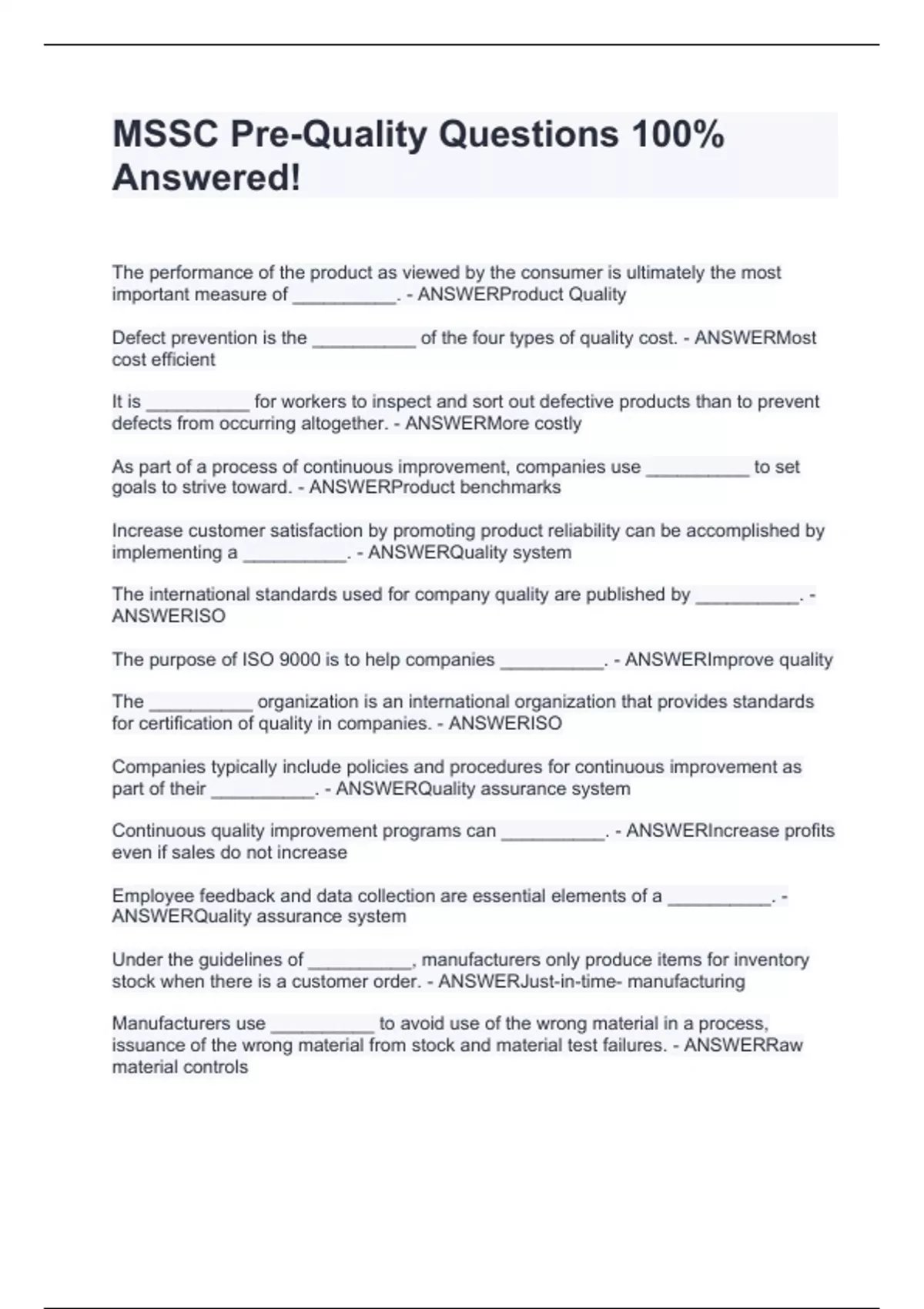 The performance of the product as viewed by the consumer is ultimately the most important measure of __________. - ANSWERProduct Quality Defect prevention is the __________ of the four types of quality cost. - ANSWERMost cost efficient It is __________ for workers to inspect and sort out defective products than to prevent defects from occurring altogether. - ANSWERMore costly As part of a process of continuous improvement, companies use __________ to set goals to strive toward. - ANSWERProduct benchmarks Increase customer satisfaction by promoting product reliability can be accomplished by implementing a __________. - ANSWERQuality system The international standards used for company quality are published by __________. - ANSWERISO The purpose of ISO 9000 is to help companies __________. - ANSWERImprove quality The __________ organization is an international organization that provides standards for certification of quality in companies. - ANSWERISO Companies typically include policies and procedures for continuous improvement as part of their __________. - ANSWERQuality assurance system Continuous quality improvement programs can __________. - ANSWERIncrease profits even if sales do not increase Employee feedback and data collection are essential elements of a __________. - ANSWERQuality assurance system Under the guidelines of __________, manufacturers only produce items for inventory stock when there is a customer order. - ANSWERJust-in-time- manufacturing Manufacturers use __________ to avoid use of the wrong material in a process, issuance of the wrong material from stock and material test failures. - ANSWERRaw material controls