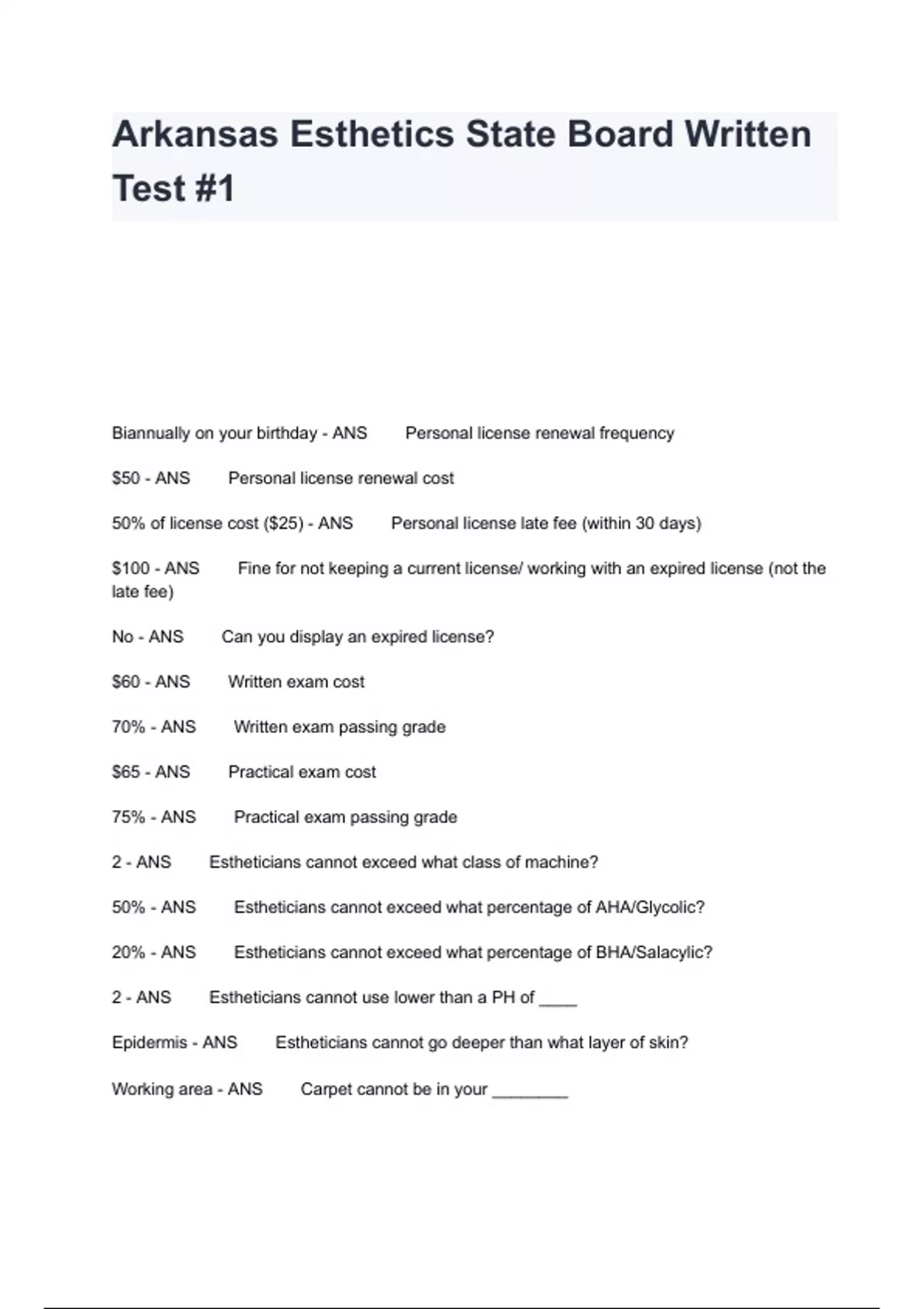 Arkansas Esthetics State Board Written Test #1 Biannually on your birthday - ANS Personal license renewal frequency $50 - ANS Personal license renewal cost 50% of license cost ($25) - ANS Personal license late fee (within 30 days) $100 - ANS Fine for not keeping a current license/ working with an expired license (not the late fee) No - ANS Can you display an expired license? $60 - ANS Written exam cost 70% - ANS Written exam passing grade $65 - ANS Practical exam cost 75% - ANS Practical exam passing grade 2 - ANS Estheticians cannot exceed what class of machine? 50% - ANS Estheticians cannot exceed what percentage of AHA/Glycolic? 20% - ANS Estheticians cannot exceed what percentage of BHA/Salacylic? 2 - ANS Estheticians cannot use lower than a PH of ____ Epidermis - ANS Estheticians cannot go deeper than what layer of skin? Working area - ANS Carpet cannot be in your ________ Cosmetology Technical Advisory Committee - ANS Define CTAC 7 - ANS Number of members in the CTAC 10 - ANS Maximum years a member can be in the CTAC 2500 - ANS Minimum square footage required for a beauty school $100 annually - ANS Establishment license cost and frequency Any product used for beautifying the skin - ANS Cosmetic Environmental Protection Agency - ANS Define EPA Service animals and fish - ANS What are the only animals allowed in salons and spas? In a covered, labeled container - ANS How to store liquids In a shaker - ANS How powders can be stored Cleaned then sharpened BEFORE each use - ANS How pencils need to be cleaned Anytime during business hours - ANS When inspectors can visit your establishment Yes - ANS Can an inspector require your ID? A student - ANS Who is an inspector not allowed to require an ID from? Yes - ANS Does your license have to be displayed? Sufficient - ANS Your work area must have _____ lighting Must be 65 years old and be active in the practice for 30 years - ANS Lifetime license requirements 21 years old - ANS Required age to be an instructor $250 annually - ANS School license renewal cost and frequency clean - ANS Your attire must always be _____ Health and Safety - ANS The committee may refuse a license to any person who may jeopardize the ____ and ____ of the public Annually - ANS Cosmetology establishments are inspected at least ______, but are not limited to Cosmetology - ANS You HAVE to offer _______ to open a beauty school 25 - ANS You need at least ___ students to open a beauty school
