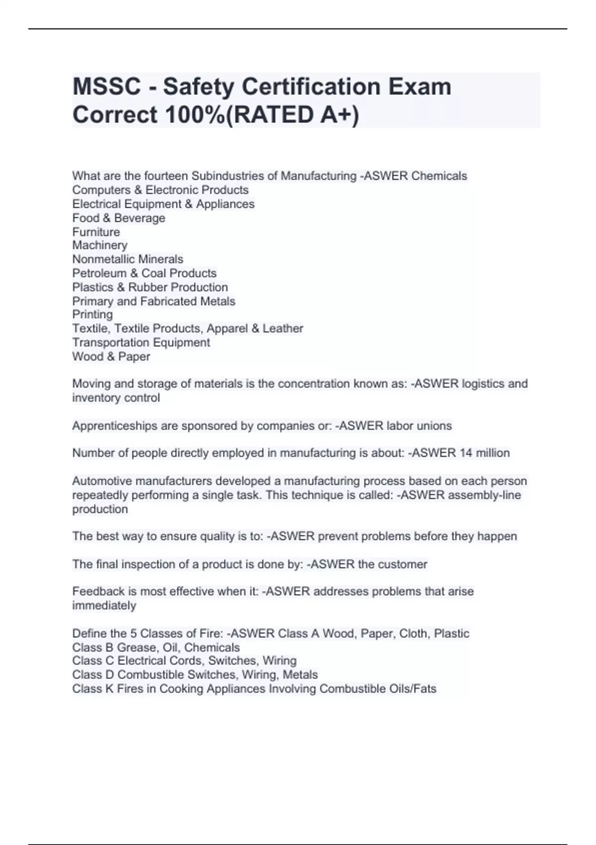What are the fourteen Subindustries of Manufacturing -ASWER Chemicals Computers & Electronic Products Electrical Equipment & Appliances Food & Beverage Furniture Machinery Nonmetallic Minerals Petroleum & Coal Products Plastics & Rubber Production Primary and Fabricated Metals Printing Textile, Textile Products, Apparel & Leather Transportation Equipment Wood & Paper Moving and storage of materials is the concentration known as: -ASWER logistics and inventory control Apprenticeships are sponsored by companies or: -ASWER labor unions Number of people directly employed in manufacturing is about: -ASWER 14 million Automotive manufacturers developed a manufacturing process based on each person repeatedly performing a single task. This technique is called: -ASWER assembly-line production The best way to ensure quality is to: -ASWER prevent problems before they happen The final inspection of a product is done by: -ASWER the customer Feedback is most effective when it: -ASWER addresses problems that arise immediately Define the 5 Classes of Fire: -ASWER Class A Wood, Paper, Cloth, Plastic Class B Grease, Oil, Chemicals Class C Electrical Cords, Switches, Wiring Class D Combustible Switches, Wiring, Metals Class K Fires in Cooking Appliances Involving Combustible Oils/Fats