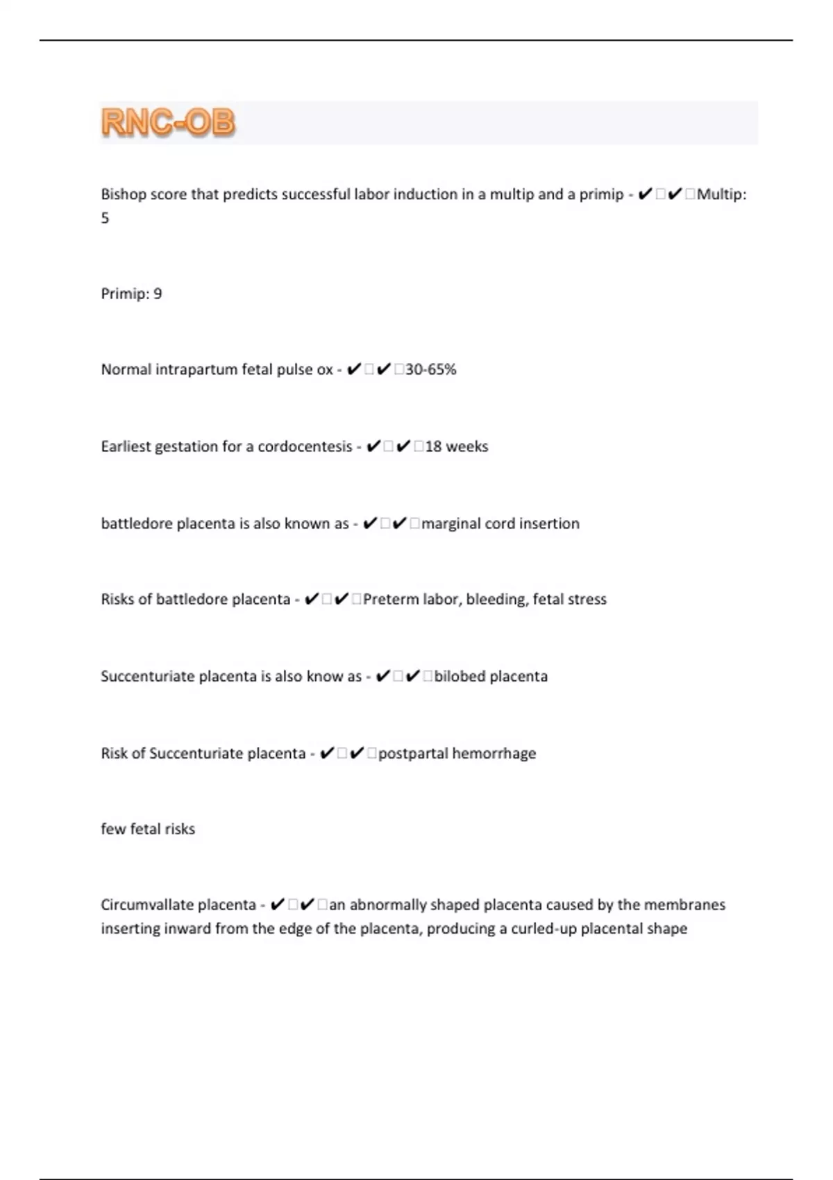 Bishop score that predicts successful labor induction in a multip and a primip - ️️Multip: 5 Primip: 9 Normal intrapartum fetal pulse ox - ️️30-65% Earliest gestation for a cordocentesis - ️️18 weeks battledore placenta is also known as - ️️marginal cord insertion Risks of battledore placenta - ️️Preterm labor, bleeding, fetal stress Succenturiate placenta is also know as - ️️bilobed placenta Risk of Succenturiate placenta - ️️postpartal hemorrhage few fetal risks Circumvallate placenta - ️️an abnormally shaped placenta caused by the membranes inserting inward from the edge of the placenta, producing a curled-up placental shape