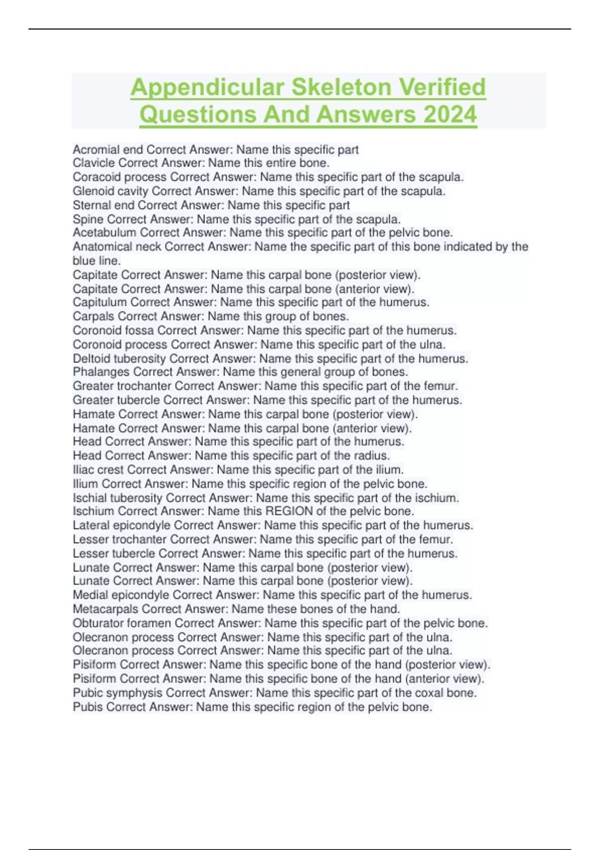 Appendicular Skeleton Verified Questions And Answers 2024 Appendicular Skeleton Verified Questions And Answers 2024