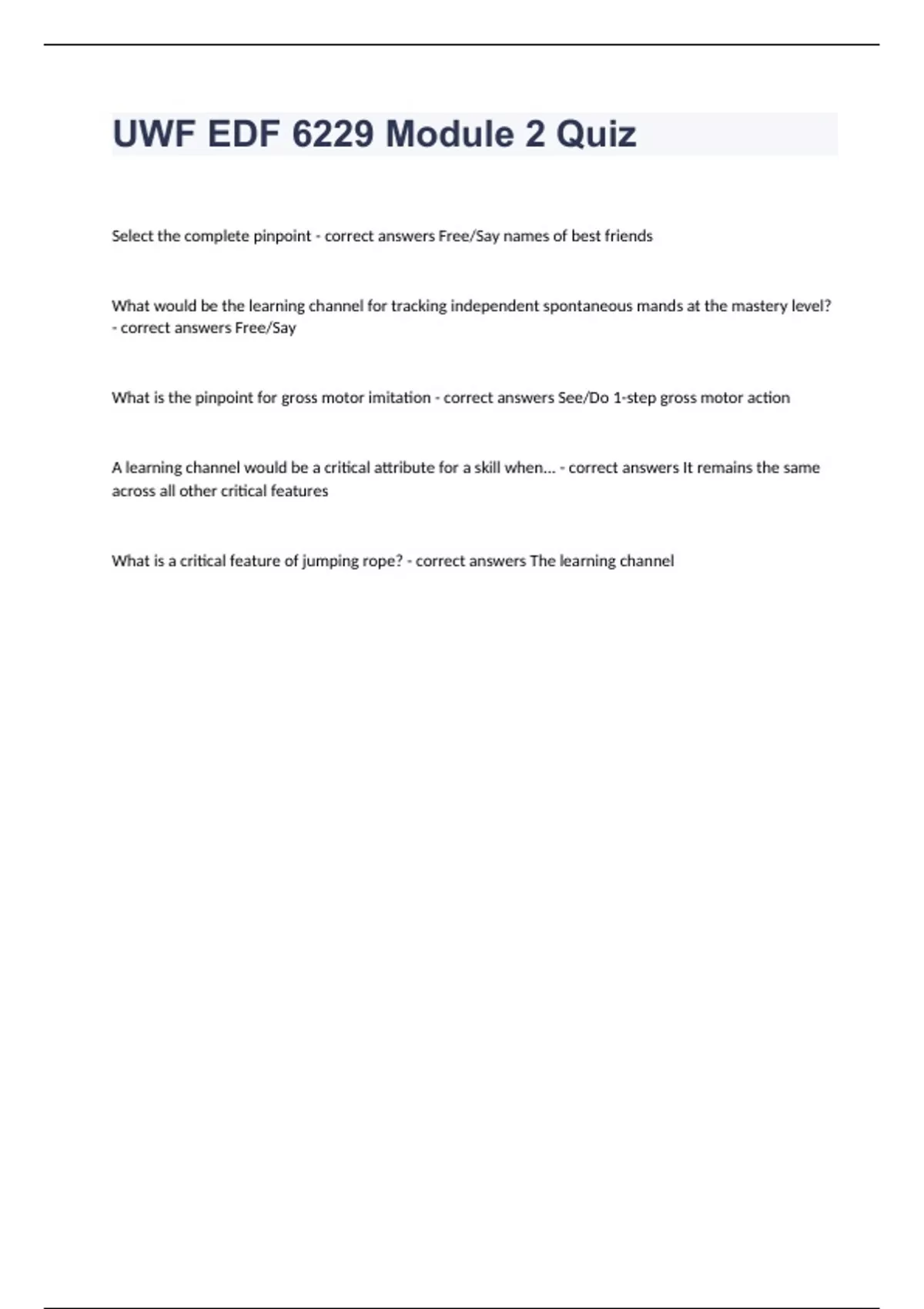 UWF EDF 6229 Module 2 Quiz Question and answers 100% correct 2024 Select the complete pinpoint - correct answers Free/Say names of best friends What would be the learning channel for tracking independent spontaneous mands at the mastery level? - correct answers Free/Say What is the pinpoint for gross motor imitation - correct answers See/Do 1-step gross motor action A learning channel would be a critical attribute for a skill when... - correct answers It remains the same across all other critical features What is a critical feature of jumpin