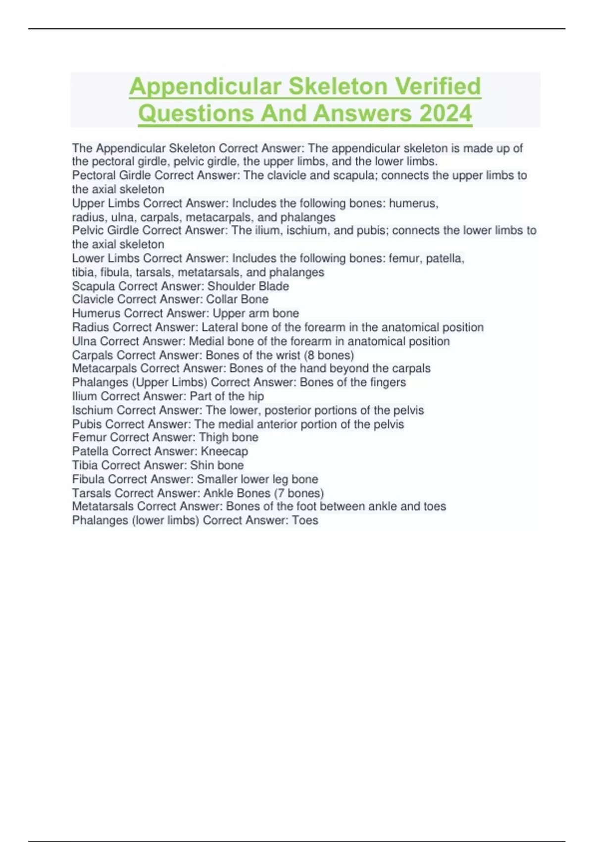 Appendicular Skeleton Verified Questions And Answers 2024 Appendicular Skeleton Verified Questions And Answers 2024