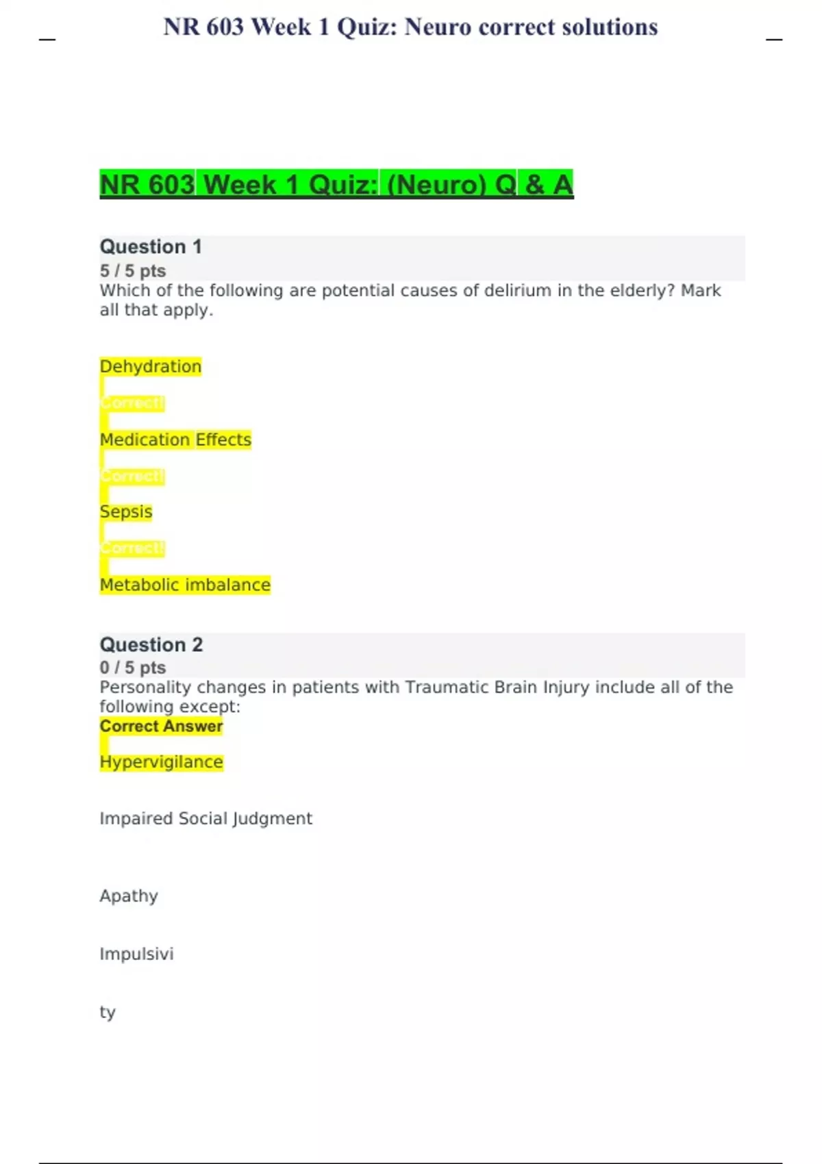 NR 603 Week 1 Quiz: (Neuro) Q & A Which of the following are potential causes of delirium in the elderly? Mark all that apply. Dehydration Correct! Medication Effects Correct! Sepsis Correct! Metabolic imbalance Personality changes in patients with Traumatic Brain Injury include all of the following except: Correct Answer Hypervigilance Impaired Social Judgment Apathy Impulsivity