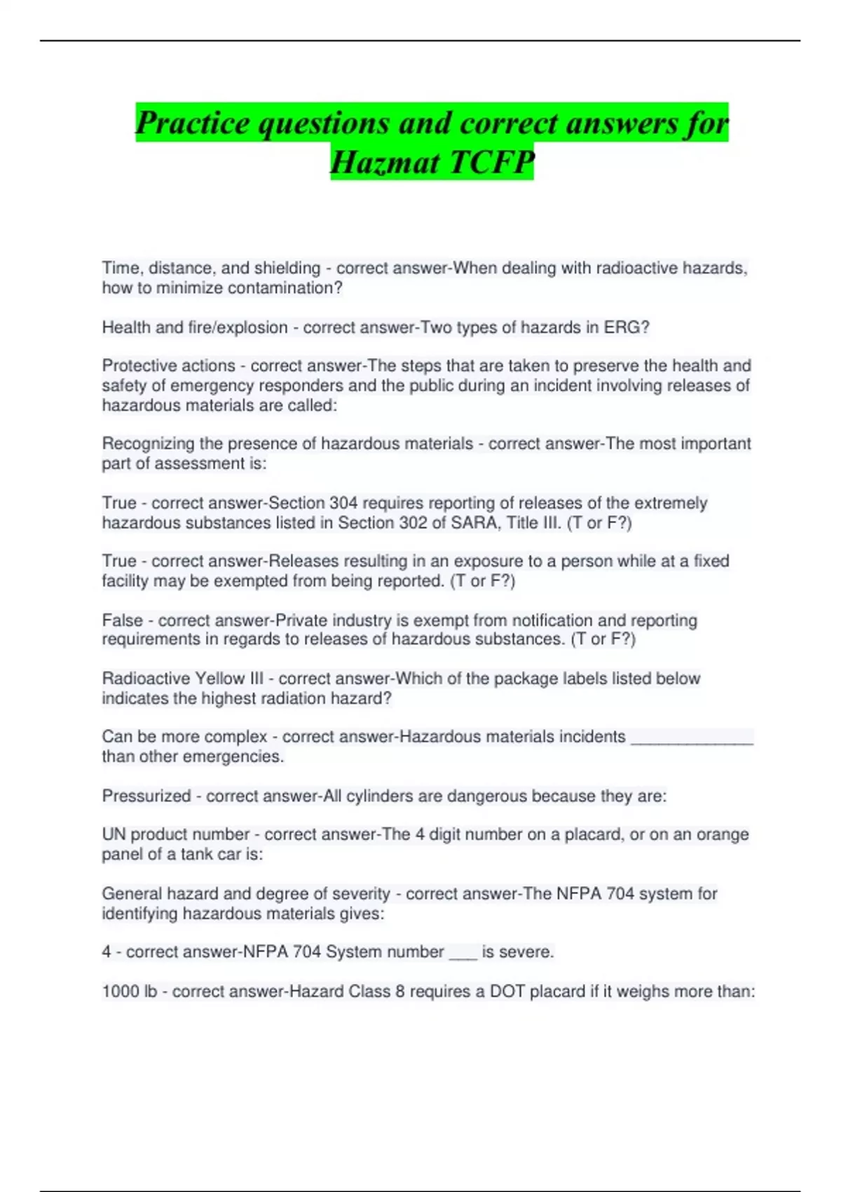 Giving the UN hazard class number - correct answer-UN/DOT placards indicate general hazard recognition by: Highway truck - correct answer-Bill of Lading Conductor/Engineer - correct answer-Waybill is the responsibility of: Near engine, near caboose, or in the engineer's possession. - correct answer-Look for train shipping papers in these locations: Preincident planning - correct answer-Hazardous occupancies should be noted in: MSDS - correct answer-Resource accessed during preincident planning: True - correct answer-Shipping papers are required to contain an entry for hazard classification according to DOT regulations. Emergency contact, name of material, and hazard class - correct answer-Hazardous material shipping paper should contain: UN hazard class - correct answer-On a placard, the number at the bottom of the diamond indicates the: White over black - correct answer-Vehicles carrying over 1001 lb of corrosive to display a _________ placard. Green - correct answer-Vehicle carrying nonflammable compressed gas has a ______ placard. Hazard class symbol - correct answer-What is the name of the picture at the top of a placard? Poison gas - correct answer-A type of gas that can be extremely toxic and is considered y the DOT to be a hazardous material is a: Poisonous materials - correct answer-Liquid or solid substances that emit toxic, dangerous, and irritating fumes are known as: Red and white stripes - correct answer-Flammable solids have ____________ on their placards. Explosive - correct answer-Orange placards represent: Oxidizers - correct answer-Hazard class 5 is?