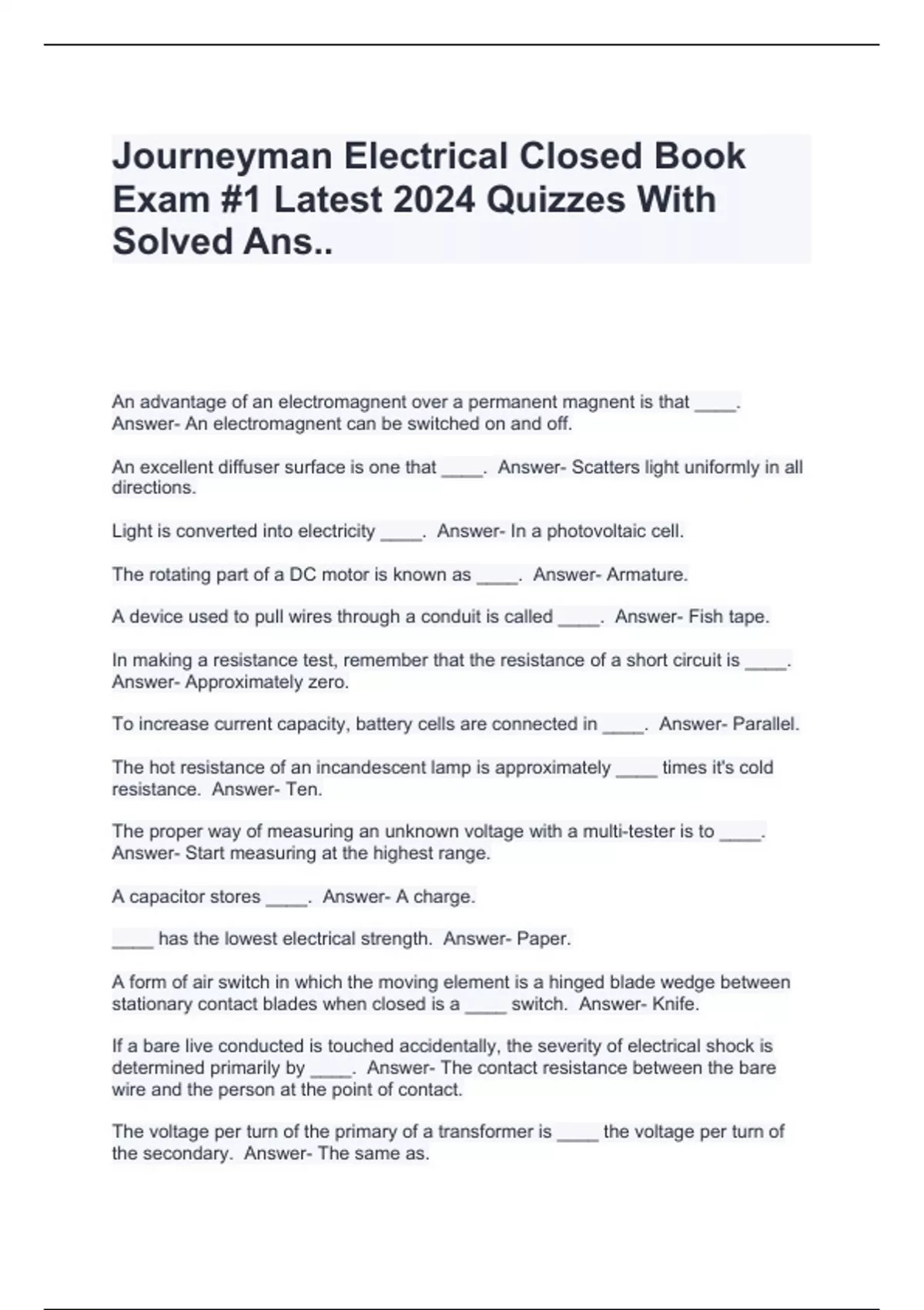 Journeyman Electrical Closed Book Exam #1 Latest 2024 Quizzes With Solved Ans..