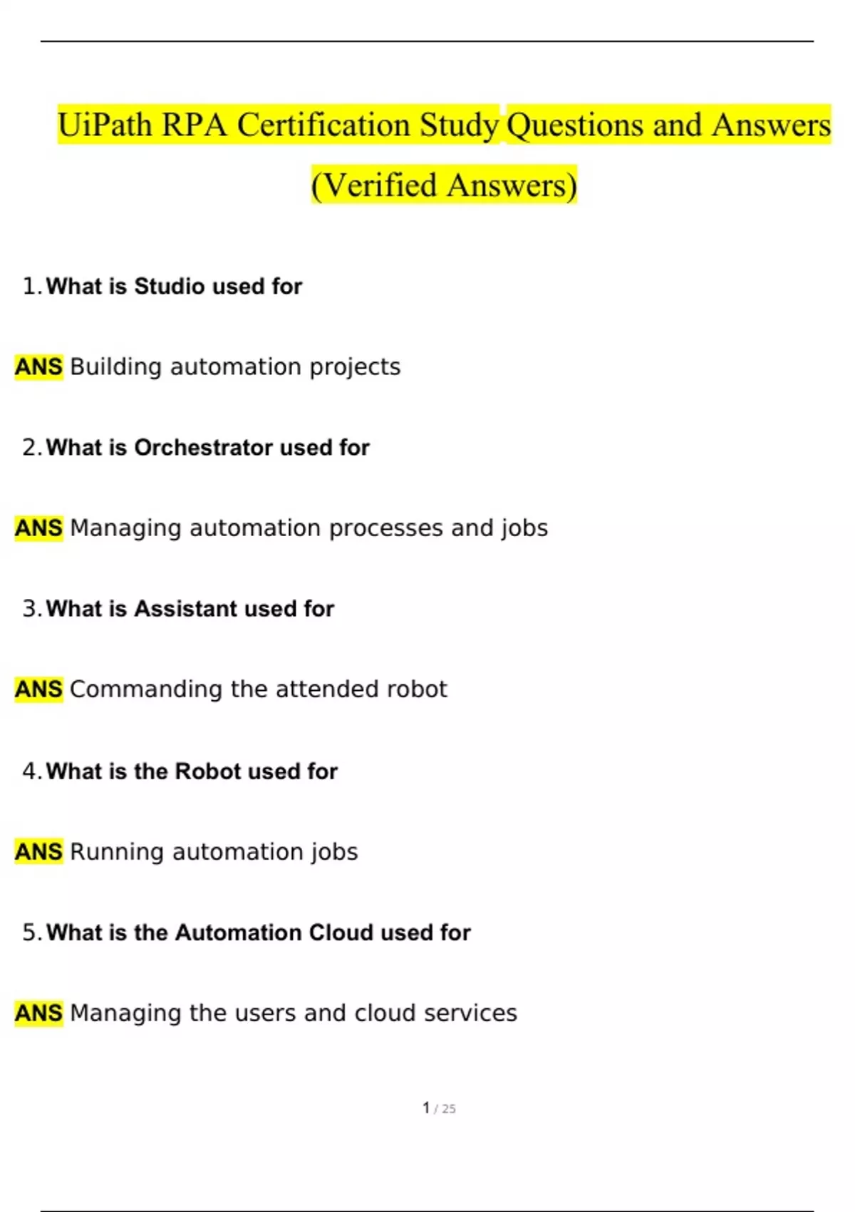 UiPath RPA Certification Study Questions and Answers (2024 / 2025) (Verified Answers)