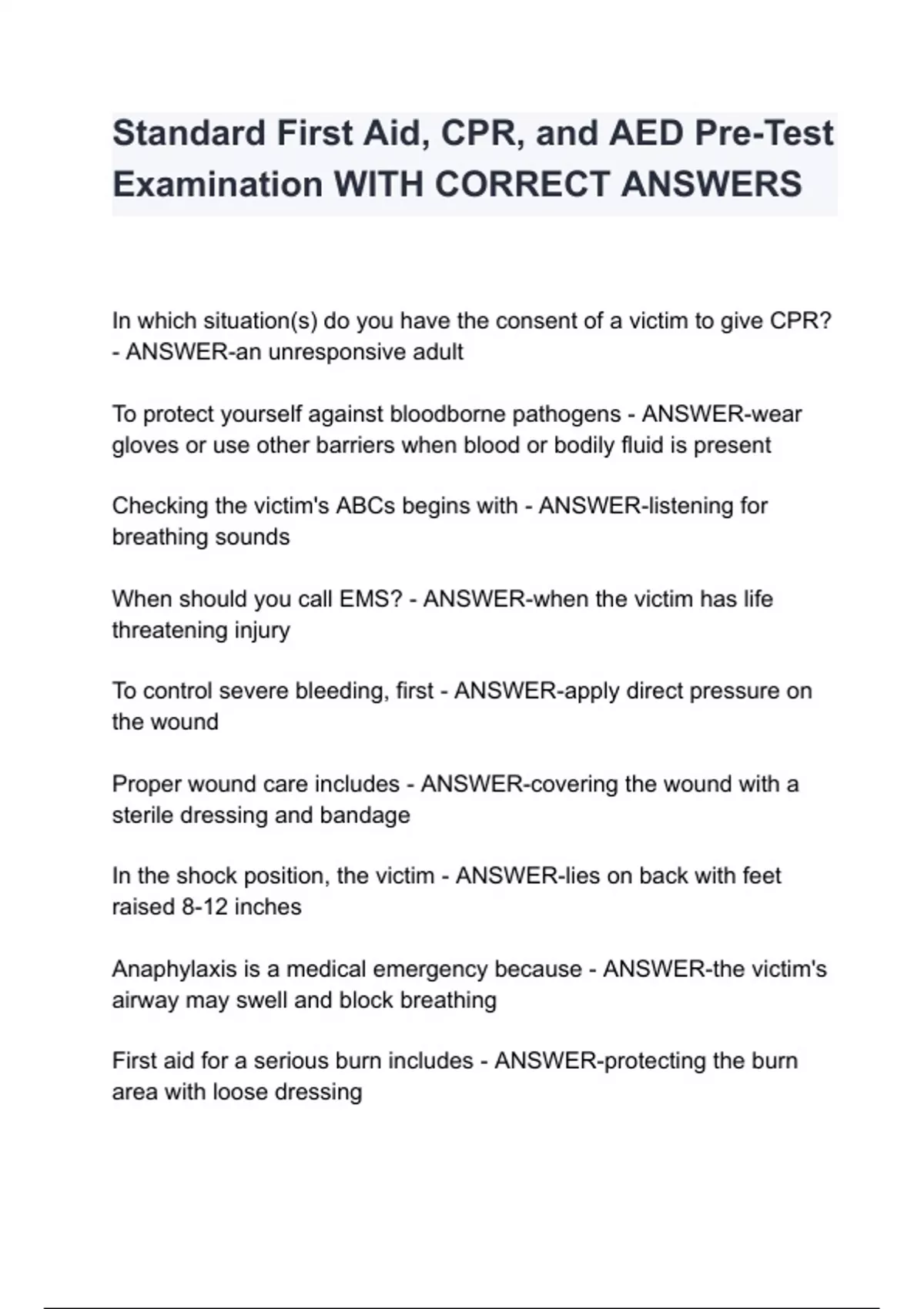 Standard First Aid, CPR, and AED Pre-Test Examination WITH CORRECT ANSWERS