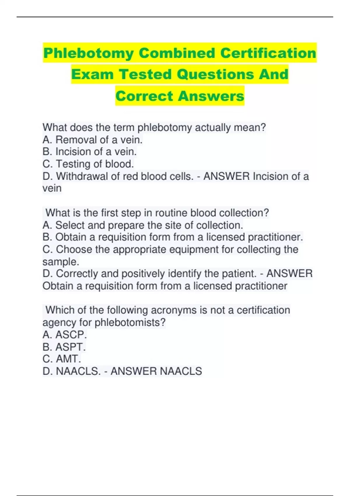 Phlebotomy Combined Certification Exam Tested Questions And Correct Answers What does the term phlebotomy actually mean? A. Removal of a vein. B. Incision of a vein. C. Testing of blood. D. Withdrawal of red blood cells. - ANSWER Incision of a vein What is the first step in routine blood collection? A. Select and prepare the site of collection. B. Obtain a requisition form from a licensed practitioner. C. Choose the appropriate equipment for collecting the sample. D. Correctly and positively identify the patient. - ANSWER Obtain a requisition form from a licensed practitioner Which of the following acronyms is not a certification agency for phlebotomists? A. ASCP. B. ASPT. C. AMT. D. NAACLS. - ANSWER NAACLS Which of the following terms is evidence that an individual has demonstrated proficiency in a particular area of practice? A. Accreditation. B. Approval. C. Certification. D. Standardization. - ANSWER Certification