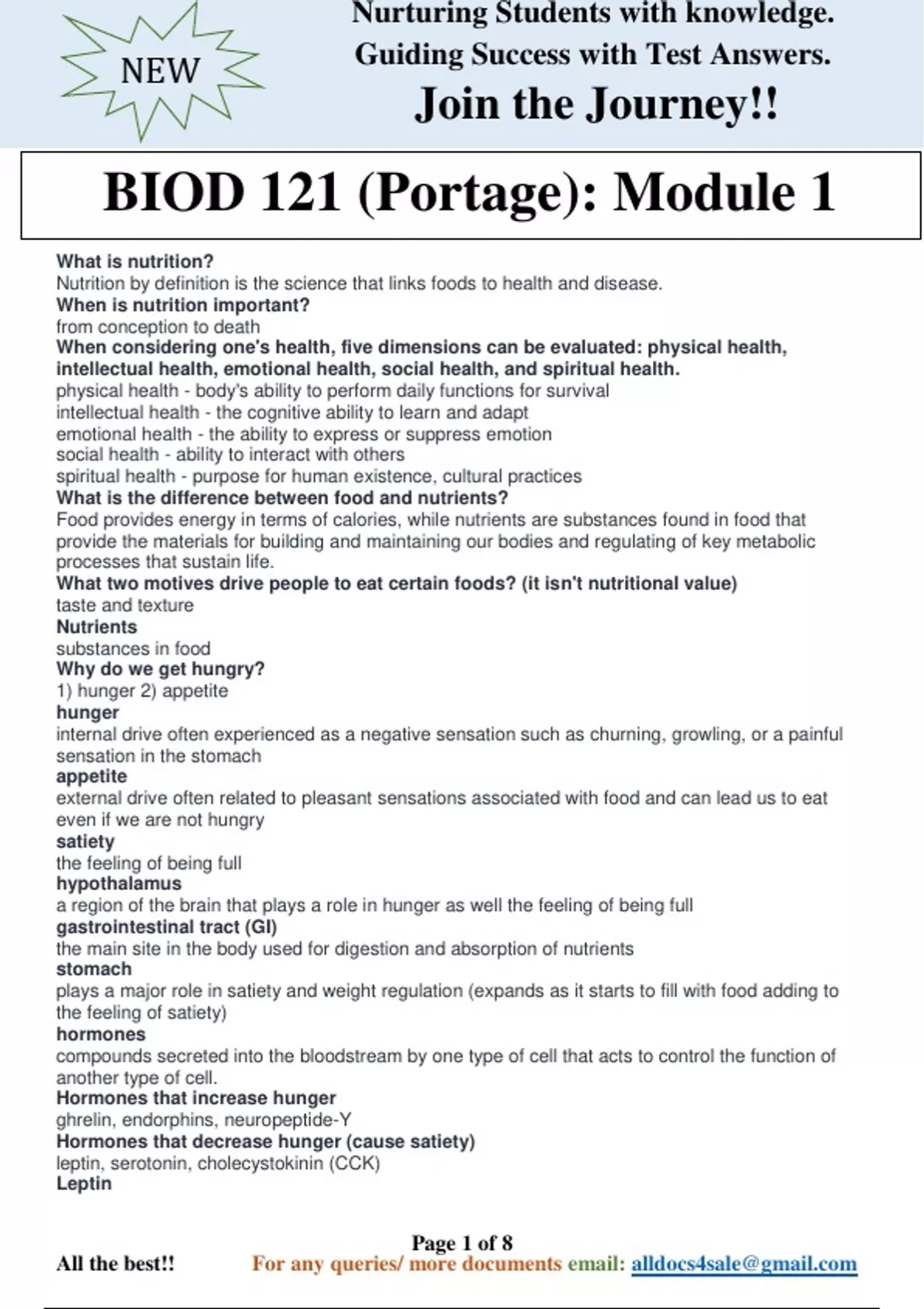 What is nutrition? Nutrition by definition is the science that links foods to health and disease. When is nutrition important? from conception to death When considering one's health, five dimensions can be evaluated: physical health, intellectual health, emotional health, social health, and spiritual health. physical health - body's ability to perform daily functions for survival intellectual health - the cognitive ability to learn and adapt emotional health - the ability to express or suppress emotion social health - ability to interact with others spiritual health - purpose for human existence, cultural practices What is the difference between food and nutrients? Food provides energy in terms of calories, while nutrients are substances found in food that provide the materials for building and maintaining our bodies and regulating of key metabolic processes that sustain life. What two motives drive people to eat certain foods? (it isn't nutritional value) taste and texture Nutrients substances in food Why do we get hungry? 1) hunger 2) appetite hunger internal drive often experienced as a negative sensation such as churning, growling, or a painful sensation in the stomach appetite external drive often related to pleasant sensations associated with food and can lead us to eat even if we are not hungry satiety the feeling of being full hypothalamus a region of the brain that plays a role in hunger as well the feeling of being full gastrointestinal tract (GI) the main site in the body used for digestion and absorption of nutrients stomach plays a major role in satiety and weight regulation (expands as it starts to fill with food adding to the feeling of satiety) hormones compounds secreted into the bloodstream by one type of cell that acts to control the function of another type of cell. Hormones that increase hunger ghrelin, endorphins, neuropeptide-Y Hormones that decrease hunger (cause satiety) leptin, serotonin, cholecystokinin (CCK) Leptin