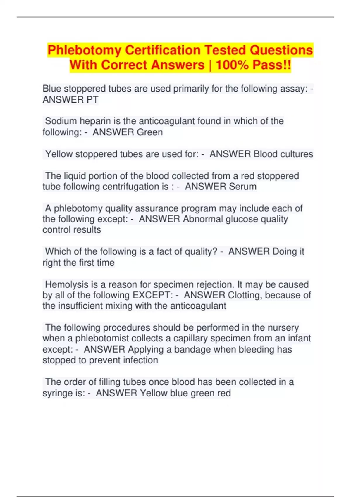 Phlebotomy Certification Tested Questions With Correct Answers | 100% Pass!! Blue stoppered tubes are used primarily for the following assay: - ANSWER PT Sodium heparin is the anticoagulant found in which of the following: - ANSWER Green Yellow stoppered tubes are used for: - ANSWER Blood cultures The liquid portion of the blood collected from a red stoppered tube following centrifugation is : - ANSWER Serum A phlebotomy quality assurance program may include each of the following except: - ANSWER Abnormal glucose quality control results Which of the following is a fact of quality? - ANSWER Doing it right the first time Hemolysis is a reason for specimen rejection. It may be caused by all of the following EXCEPT: - ANSWER Clotting, because of the insufficient mixing with the anticoagulant The following procedures should be performed in the nursery when a phlebotomist collects a capillary specimen from an infant except: - ANSWER Applying a bandage when bleeding has stopped to prevent infection
