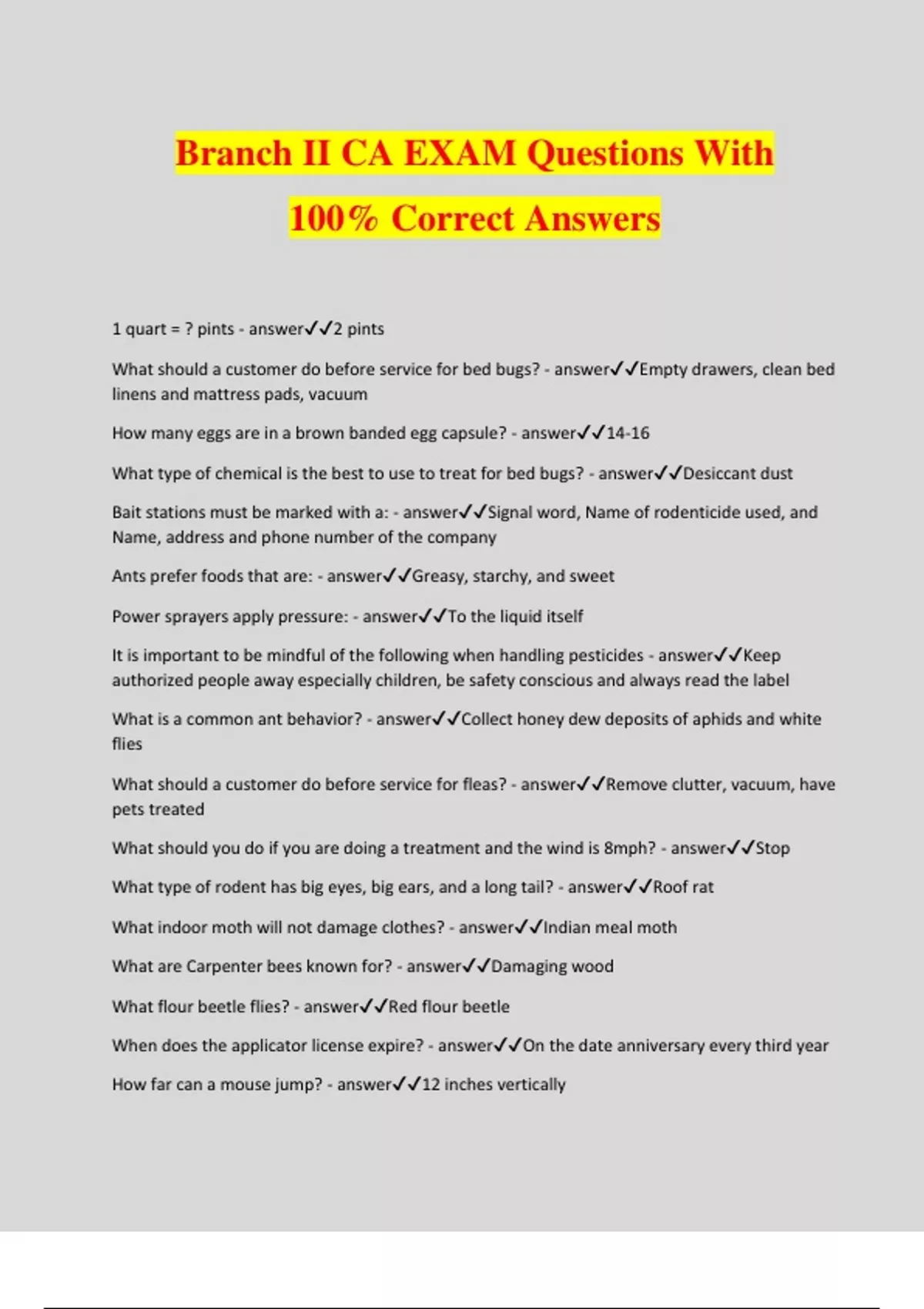 Branch II CA EXAM Questions With 100% Correct Answers 1 quart = ? pints - answer2 pints What should a customer do before service for bed bugs? - answerEmpty drawers, clean bed linens and mattress pads, vacuum How many eggs are in a brown banded egg capsule? - answer14-16 What type of chemical is the best to use to treat for bed bugs? - answerDesiccant dust Bait stations must be marked with a: - answerSignal word, Name of rodenticide used, and Name, address and phone number of the company Ants prefer foods that are: - answerGreasy, starchy, and sweet Power sprayers apply pressure: - answerTo the liquid itself It is important to be mindful of the following when handling pesticides - answerKeep authorized people away especially children, be safety conscious and always read the label What is a common ant behavior? - answerCollect honey dew deposits of aphids and white flies What should a customer do before service for fleas? - answerRemove clutter, vacuum, have pets treated What should you do if you are doing a treatment and the wind is 8mph? - answerStop What type of rodent has big eyes, big ears, and a long tail? - answerRoof rat What indoor moth will not damage clothes? - answerIndian meal moth What are Carpenter bees known for? - answerDamaging wood What flour beetle flies? - answerRed flour beetle When does the applicator license expire? - answerOn the date anniversary every third year How far can a mouse jump? - answer12 inches vertically What tick is known for spreading or giving Lyme disease? - answerWestern black legged tick in western U.S. Who is to be notified of a pesticide spill? - answerCounty agriculture commissioner and local authorities What is the most important part of eradicating a store product pest? - answerFinding and removing source The gestation period for mice is: - answer17-19 days If requested by the County Ag Commissioner, notice of each fumigation will be given the commissioner's office at least: - answer48 hours prior to fumigation What do Emulsifiable concentrates look similar to - answerSoda The best examples of pesticides are: - answerDefoliants, herbicides, insecticides, insect growth regulators and others. What is the typical length of time a bed bug needs to complete each blood meal? - answer3-10 minutes Which of the following features characterize a brown recluse spider? - answerViolin shaped markings on top of cephalothorax What type of chemical is a pyrethrin? - answerBotanical Which material is an anti-coagulant? - answerWarfarin Which of the following pesticide formulations should be used to avoid visible residues? - answerEmulsifiable concentrations Where do bumble bees nest? - answerUnderground Power sprayers are used to: - answerProvide more pressure and/or volume Ants remove dust from their antennae and legs by drawing them through the comb of the_________and the spur of the_______. - answerTarsus, tibia Gophers are - answerRodents What type of standard headgear is recommended? - answerWater resistant wide-brimmed hat What insect should you use cotton gloves to treat? - answerStored product pest Which screen will allow the largest granules to pass through? - answer20 screen A Norway rat can burrow - answer5-6 ft Proper treatment for carpenter bees are: - answerDust each gallery with dust and close opening 1 gallon of water = - answer8.3 lbs For rodent exclusion, what is the minimum distance from the bottom of a door that a kick-plate should cover? - answerNo less than 1 foot and fit the jambs and door linings What is the minimum time warning signs must be posted prior to and after a pesticide application at a school? - answer24 hours before and 72 hours after the application Which bird is the most effective predator for rodents? - answerOwl What are the four routes through which pesticides can contact your body and cause you to be exposed? - answerOral, inhalation, ocular, dermal Which route of exposure should you, as a pesticide handler, be most concerned about? - answerExposure to the skin (dermal) is the most common route of exposure for pesticide handlers What should you do to control a spill situation? - answerProtect yourself, contain the spill, protect others, stay at the site Fumigation crews should have - answerTwo respiratory protection devices approved for the type of gas they are using How do you treat in a zoo? - answerIPM, least toxic, use nature (insects to kill other insects, exclusion, trapping Do you wear gloves if label does not require? - answerYes, as long as the label does not prohibit it. Where would you find a fungus gnat? - answerIn a potted plant Fire ants are - answerOmnivores What best describes mouse droppings? - answerRod shaped What is the smallest roach? - answerGerman roach The acronym to remember yellow ants is - answer(BLT) Big headed, large yellow, thief How far can Norway rats jump? - answer3 ft vertically What can rats develop? - answerRegular feeding habits