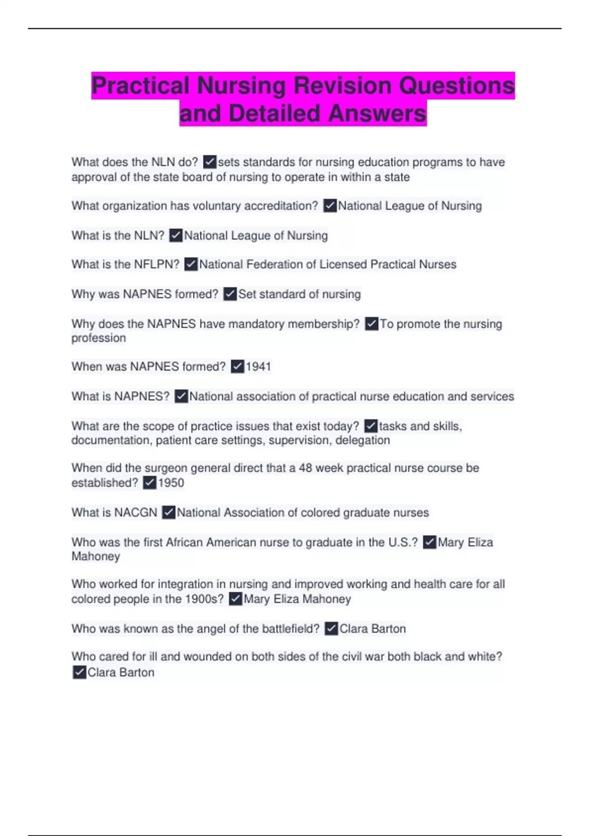 What does the NLN do? sets standards for nursing education programs to have approval of the state board of nursing to operate in within a state What organization has voluntary accreditation? National League of Nursing What is the NLN? National League of Nursing What is the NFLPN? National Federation of Licensed Practical Nurses Why was NAPNES formed? Set standard of nursing Why does the NAPNES have mandatory membership? To promote the nursing profession When was NAPNES formed? 1941 What is NAPNES? National association of practical nurse education and services