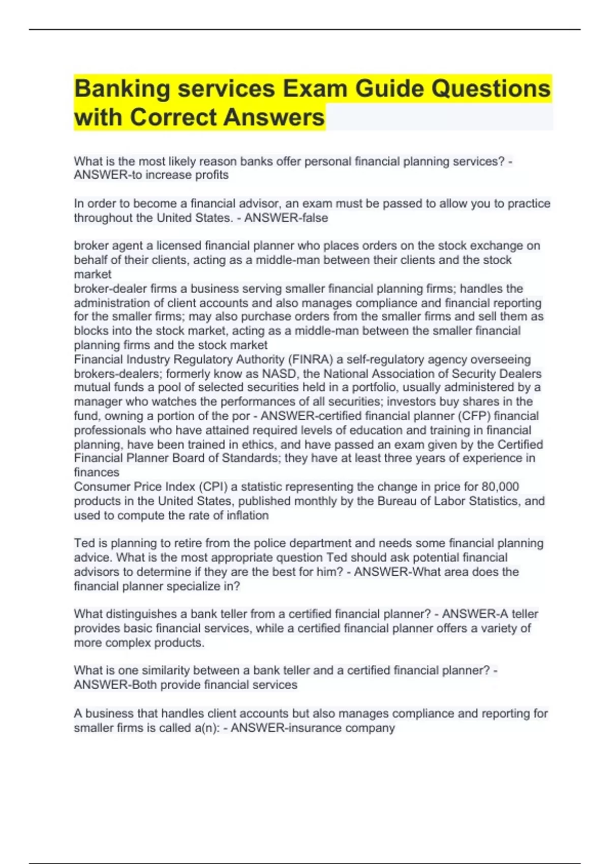 What is the most likely reason banks offer personal financial planning services? - ANSWER-to increase profits In order to become a financial advisor, an exam must be passed to allow you to practice throughout the United States. - ANSWER-false broker agent a licensed financial planner who places orders on the stock exchange on behalf of their clients, acting as a middle-man between their clients and the stock market broker-dealer firms a business serving smaller financial planning firms; handles the administration of client accounts and also manages compliance and financial reporting for the smaller firms; may also purchase orders from the smaller firms and sell them as blocks into the stock market, acting as a middle-man between the smaller financial planning firms and the stock market Financial Industry Regulatory Authority (FINRA) a self-regulatory agency overseeing brokers-dealers; formerly know as NASD, the National Association of Security Dealers mutual funds a pool of selected securities held in a portfolio, usually administered by a manager who watches the performances of all securities; investors buy shares in the fund, owning a portion of the por - ANSWER-certified financial planner (CFP) financial professionals who have attained required levels of education and training in financial planning, have been trained in ethics, and have passed an exam given by the Certified Financial Planner Board of Standards; they have at least three years of experience in finances Consumer Price Index (CPI) a statistic representing the change in price for 80,000 products in the United States, published monthly by the Bureau of Labor Statistics, and used to compute the rate of inflation Ted is planning to retire from the police department and needs some financial planning advice. What is the most appropriate question Ted should ask potential financial advisors to determine if they are the best for him? - ANSWER-What area does the financial planner specialize in? What distinguishes a bank teller from a certified financial planner? - ANSWER-A teller provides basic financial services, while a certified financial planner offers a variety of more complex products. What is one similarity between a bank teller and a certified financial planner? - ANSWER-Both provide financial services A business that handles client accounts but also manages compliance and reporting for smaller firms is called a(n): - ANSWER-insurance company