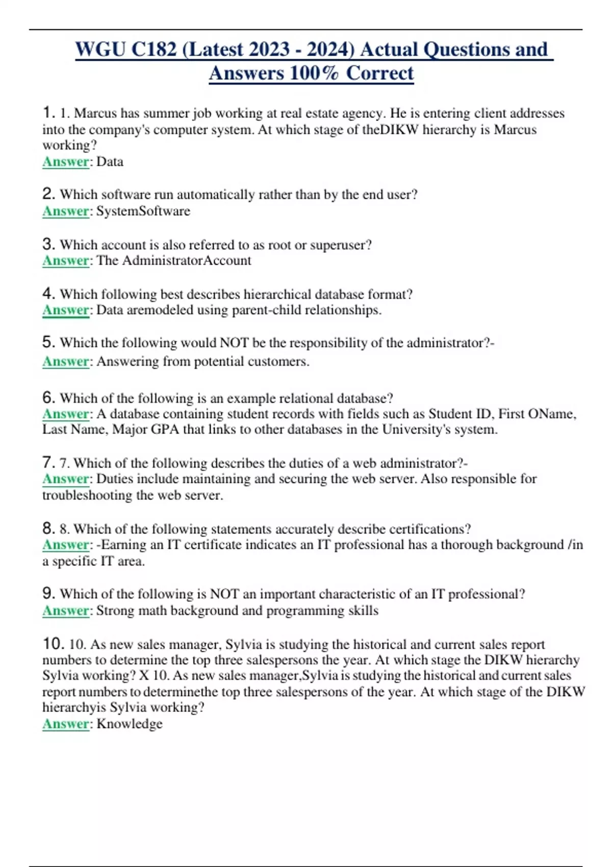 WGU C182 (Latest ) Actual Questions and Answers 100% Correct 1. 1. Marcus has summer job working at real estate agency. He is entering client addresses into the company's computer system. At which stage of theDIKW hierarchy is Marcus working? Answer: Data 2. Which software run automatically rather than by the end user? Answer: SystemSoftware 3. Which account is also referred to as root or superuser? Answer: The AdministratorAccount 4. Which following best describes hierarchical database format? Answer: Data aremodeled using parent-child relationships. 5. Which the following would NOT be the responsibility of the administrator?- Answer: Answering from potential customers. 6. Which of the following is an example relational database? Answer: A database containing student records with fields such as Student ID, First OName, Last Name, Major GPA that links to other databases in the University's system. 7. 7. Which of the following describes the duties of a web administrator?- Answer: Duties include maintaining and securing the web server. Also responsible for troubleshooting the web server. 8. 8. Which of the following statements accurately describe certifications? Answer: -Earning an IT certificate indicates an IT professional has a thorough background /in a specific IT area. 9. Which of the following is NOT an important characteristic of an IT professional? Answer: Strong math background and programming skills 10. 10. As new sales manager, Sylvia is studying the historical and current sales report numbers to determine the top three salespersons the year. At which stage the DIKW hierarchy Sylvia working? X 10. As new sales manager,Sylvia isstudying the historical and currentsales report numbersto determinethe top three salespersons of the year. At which stage of the DIKW hierarchyis Sylvia working? Answer: Knowledge