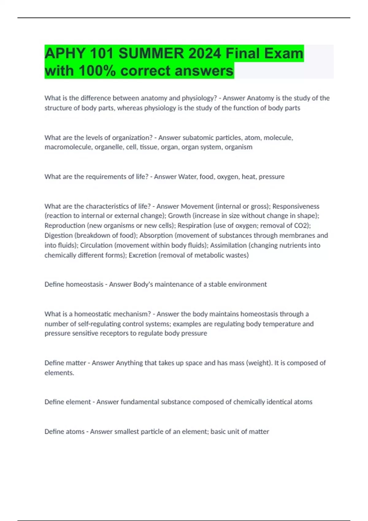 APHY 101 SUMMER 2024 Final Exam with 100% correct answers What is the difference between anatomy and physiology? - Answer Anatomy is the study of the structure of body parts, whereas physiology is the study of the function of body parts What are the levels of organization? - Answer subatomic particles, atom, molecule, macromolecule, organelle, cell, tissue, organ, organ system, organism What are the requirements of life? - Answer Water, food, oxygen, heat, pressure What are the characteristics of life? - Answer Movement (internal or gross); Responsiveness (reaction to internal or external change); Growth (increase in size without change in shape); Reproduction (new organisms or new cells); Respiration (use of oxygen; removal of CO2); Digestion (breakdown of food); Absorption (movement of substances through membranes and into fluids); Circulation (movement within body fluids); Assimilation (changing nutrients into chemically different forms); Excretion (removal of metabolic wastes)