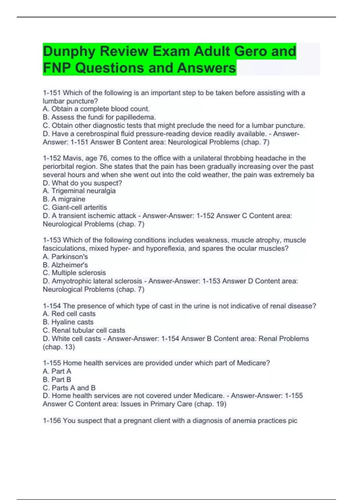 Dunphy Review Exam Adult Gero and FNP Questions and Answers