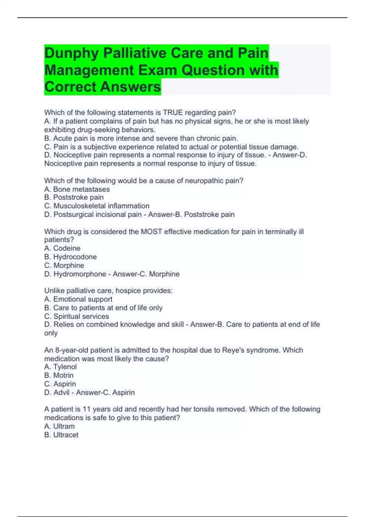 Dunphy Palliative Care and Pain Management Exam Question with Correct Answers