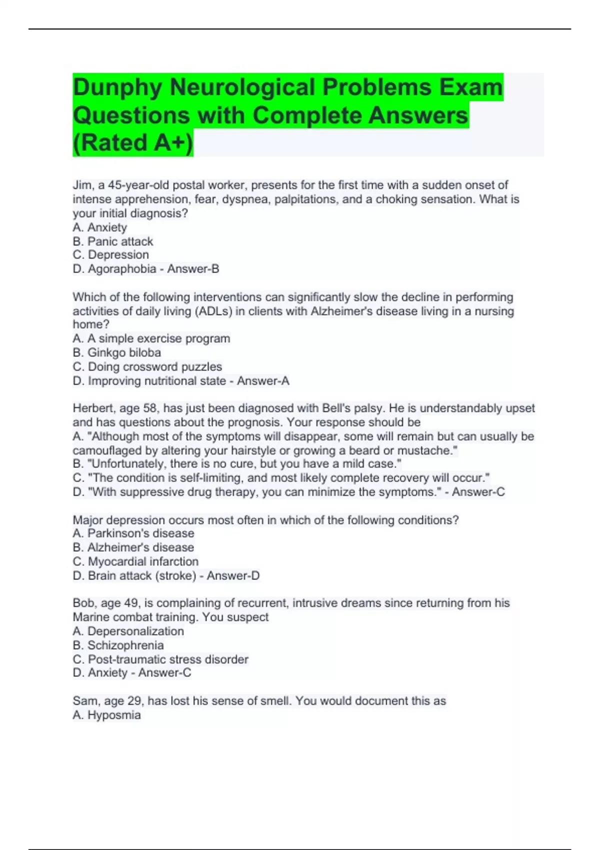 Dunphy Neurological Problems Exam Questions with Complete Answers (Rated A+)