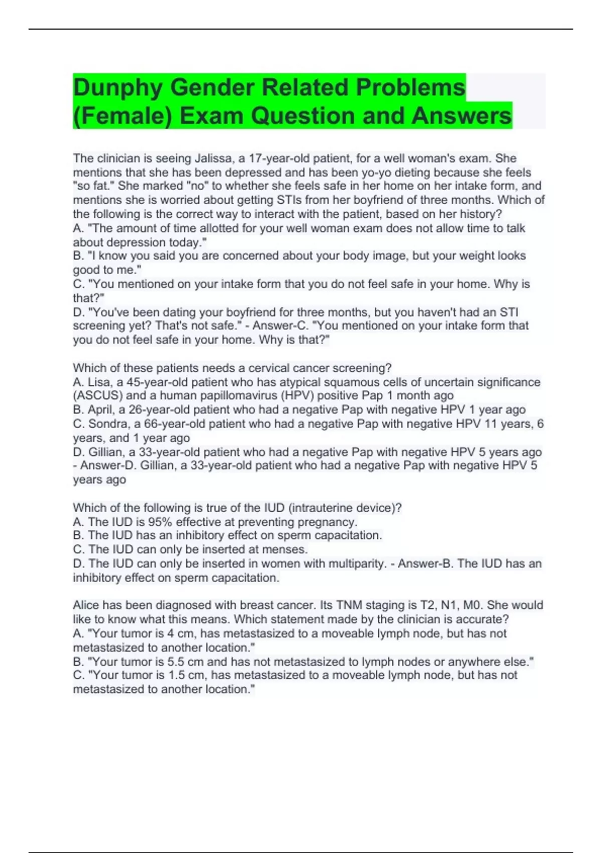 Dunphy Gender Related Problems (Female) Exam Question and Answers Tina is an 18-year-old female who would like to start using the transdermal contraceptive patch. Which of the following instructions should the clinician discuss with Tina? A. Obesity can decrease the effectiveness of the patch. B. The patch should be applied to the buttocks or breasts. C. The patch is changed every 10 days. D. If a patch becomes detached for less than 24 hours, it cannot be reapplied. - Answer-A. Obesity can decrease the effectiveness of the patch. A 26-year-old woman is seen with complaints of irregular vaginal bleeding. Which of the following tests should be the first priority? A. Pregnancy test B. Pelvic ultrasound C. Endometrial biopsy D. Platelet count - Answer-A. Pregnancy test A 42-year-old woman presents to the clinic with complaints of painful intercourse for the last month. Which of the following should be explored as the likely cause of her dyspareunia? A. Menopause B. Dehydration C. Excess progesterone D. Excess lubrication - Answer-A. Menopause A 36-year-old woman is seen with complaints of vaginal itching, burning, and discharge. On potassium hydroxide (KOH) wet mount of vaginal discharge, the clinician notices hyphae. Which of the following treatments would be appropriate? A. Fluconazole B. Estrogen vaginal cream C. Metronidazole D. Doxycycline - Answer-A. Fluconazole A 21-year-old woman is seen in the clinic requesting birth control pills. Which of the following tests is essential before prescribing any oral contraceptive? A. Pregnancy test B. Complete blood cell count C. Thyroid-stimulating hormone D. Urine dip for protein - Answer-A. Pregnancy test A 40-year-old woman is seen for her yearly examination. She is single and not in a monogamous relationship. Her social history includes smoking cigarettes "occasionally"