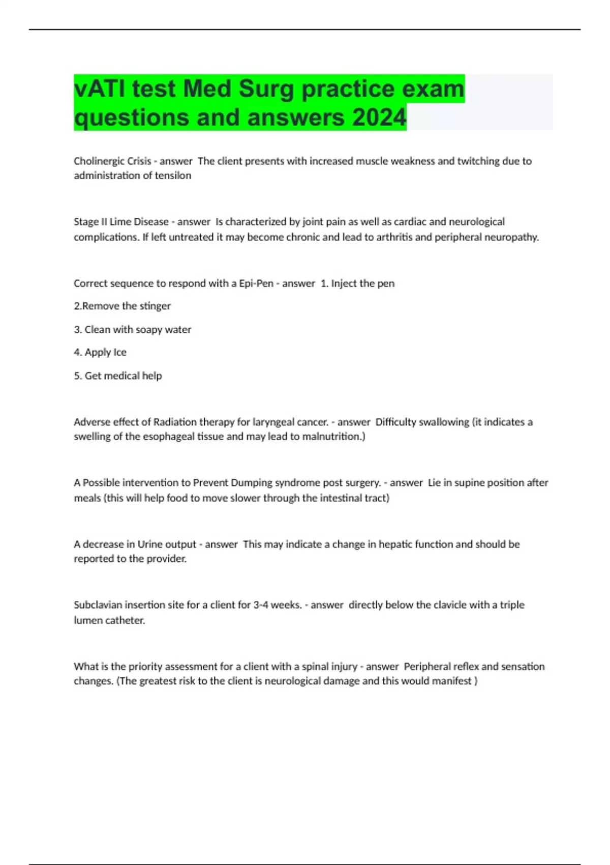 Cholinergic Crisis The client presents with increased muscle weakness and twitching due to administration of tensilon Stage II Lime Disease Is characterized by joint pain as well as cardiac and neurological complications. If left untreated it may become chronic and lead to arthritis and peripheral neuropathy. Correct sequence to respond with a Epi-Pen 1. Inject the pen 2.Remove the stinger 3. Clean with soapy water 4. Apply Ice 5. Get medical help Adverse effect of Radiation therapy for laryngeal cancer. Difficulty swallowing (it indicates a swelling of the esophageal tissue and may lead to malnutrition.) A Possible intervention to Prevent Dumping syndrome post surgery. Lie in supine position after meals (this will help food to move slower through the intestinal tract) A decrease in Urine output This may indicate a change in hepatic function and should be reported to the provider. Subclavian insertion site for a client for 3-4 weeks. directly below the clavicle with a triple lumen catheter. What is the priority assessment for a client with a spinal injury Peripheral reflex and sensation changes. (The greatest risk to the client is neurological damage and this would manifest ) Priority assessment for a client with status epilepticus having a seizure. Level of oxygenation. Using the ABCs Intervention for a client having a tonic-clonic seizure who has become cyanotic Turn them onto their side. This will provide a patent airway. Highest priority in a casted patient Decreased blood flow past the casted area (may be manifested by decreased pulse pressure) First priority for a client with a fever cough and sweating Initiate airborne precautions Priority intervention post any type of transplant Provide immunosuppressive agents Post TB treatment instructions After three negative sputum cultures the client is considered non-infectious. Teaching for IBS Increase daily intake of fiber because it helps produce bulky soft stools and establish patterns of bowel relief. Placement of leads for ECG Flat surfaces on extremities. Assessment for a client receiving Heparin Petechiae ( Teaching for client with a hearing aid Background noises are often a challenging and will require some adjustment Teaching for clients with arthritis Consistency of exercise schedule is important. Possible complication post Eye surgery Moderate pain and vomiting (this may represent intraocular pressure or hemorrhage) Possible complication of a TERP surgery The client has red colored urine with occasional clots (this could represent arterial bleeding) A sign of digoxin toxicity Visual disturbances Important to report about IV insertion site Swelling (this could mean infiltration or leakage at the insertion site.) Adverse side effect of Mannitol Headache (notify the physician immediately) This assessment finding signifies Hemolytic transfusion reaction. low back pain and apprehension. Ibuprofen common side effect GI bleending Acetylcisteine (Mucomyst) This drug is used to thin secretions in the pulmonary making it easier for the client to cough up stuff. Common side effect of iron supplement Constipation (recommend an increase in dietary fiber for this client.) Placement of client for insertion of subclavian IV catheter. Trendelenburg position. A finding of Tension Pneumothorax Chest asymmetry. In diabetic keytone acidosis The blood glucose level is above 300 Nursing intervention post Thyroidectomy Provide humidified oxygen (this promotes easier breathing and can relieve some muscle and nerve distress) Treatment for biliary Colic ( spasms) Anticholinergics. (these are muscle relaxers and will relieve spasms) This is a positive response to HIV treatment a decrease in viral load Proprnolol Hydrochloride is a beta Blocker non-selective beta blockers cause broncho-constriction especially in clients who have