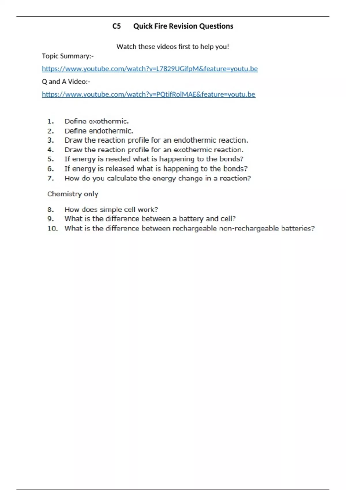 GCSE Chemistry C5 Quick Fire Questions + Vid Links