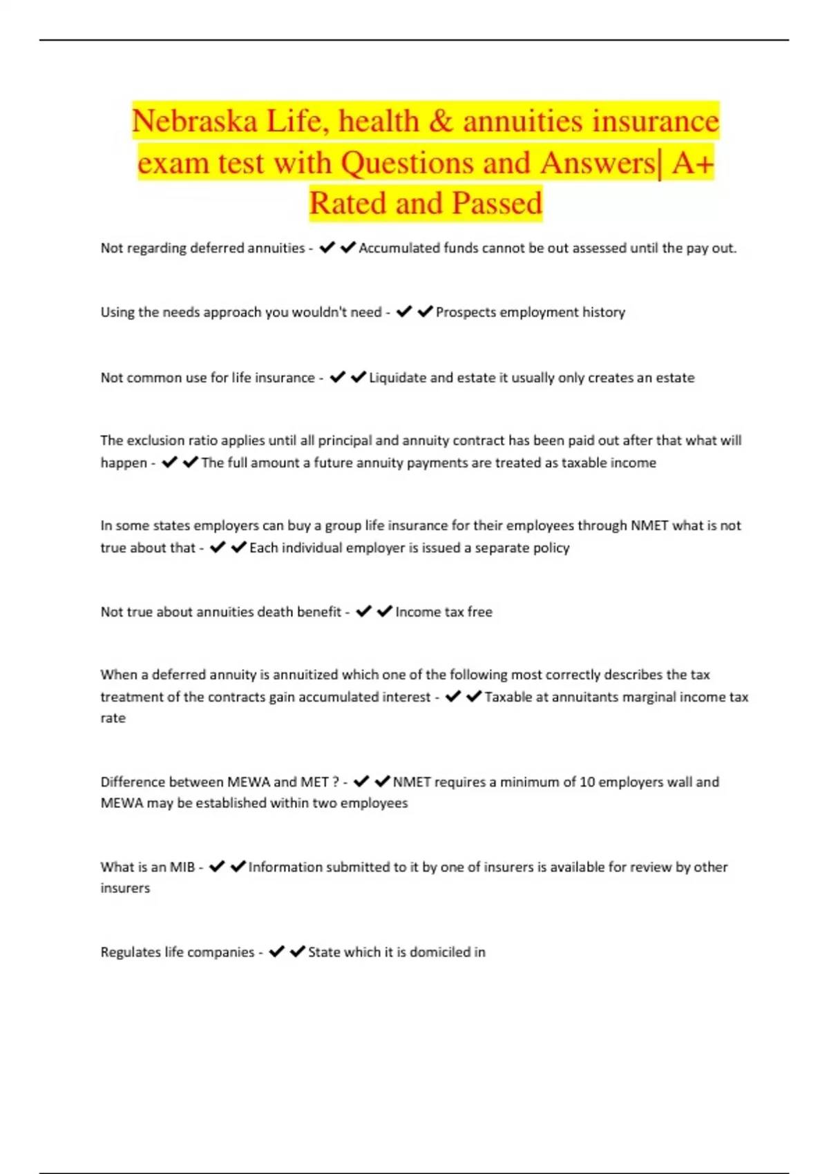 Nebraska Life, health & annuities insurance exam test with Questions and Answers| A+ Rated and Passed